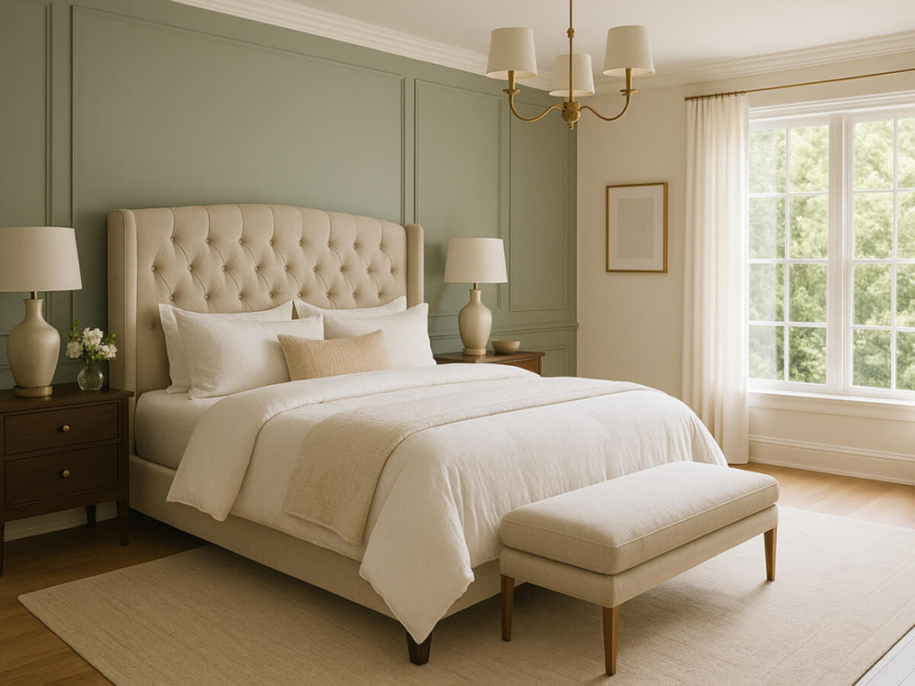 Подход основан на спокойных теплых оттенках: кремовый, бежевый, сложные тона голубого или серо-зеленого. Золото и латунь используются умеренно. Цветовая схема должна быть мягкой, устойчивой и не перегруженной контрастами.