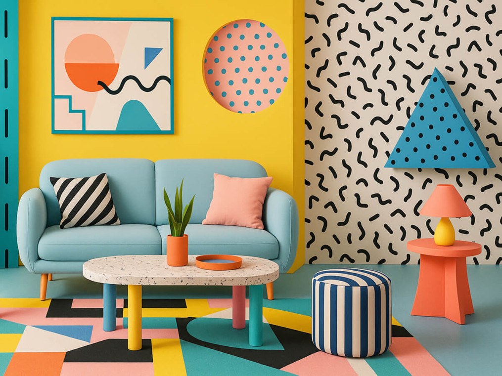 Стиль Мемфис в интерьере – это стиль дизайна, который легко узнать. Яркий, смелый и нарочито «неправильный». Геометрия, асимметрия, контрастные цвета — всё это характеризует его. В отличие от других направлений, он не пытается быть сдержанным или элегантным. Он громкий, дерзкий и, иногда, немного абсурдный. Но именно эта визуальная свобода делает его уникальным.