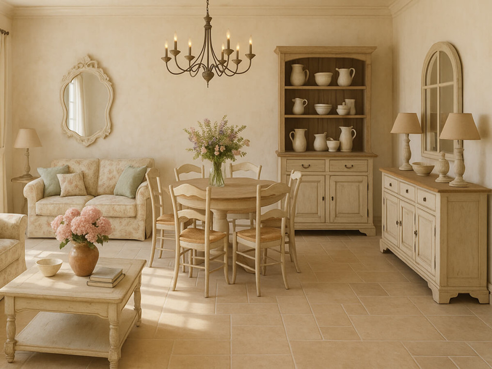 Столы и стулья часто имеют светлые тона, и могут быть немного состарены, что придает им шарм «прошлого времени». Мебель, как правило, не тяжелая и не громоздкая, чтобы сохранять воздушность и легкость пространства. Важно помнить, что мебель должна быть удобной и практичной, без лишнего украшательства.