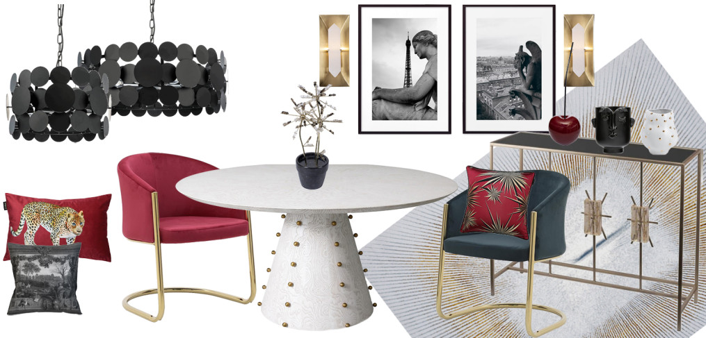 На этой неделе мы сделали подборку товаров, которые могут пригодиться для оформления столовой в доме любителей Франции. Интерьер в современной стилистике выглядит элегантно и эффектно. Золотые элементы придают оформлению актуальности. А легкую и приятную атмосферу создает декор, напоминающий о Франции: постеры с фотографиями Парижа с нестандартных ракурсов и подушка со старым изображением парка Монсо.