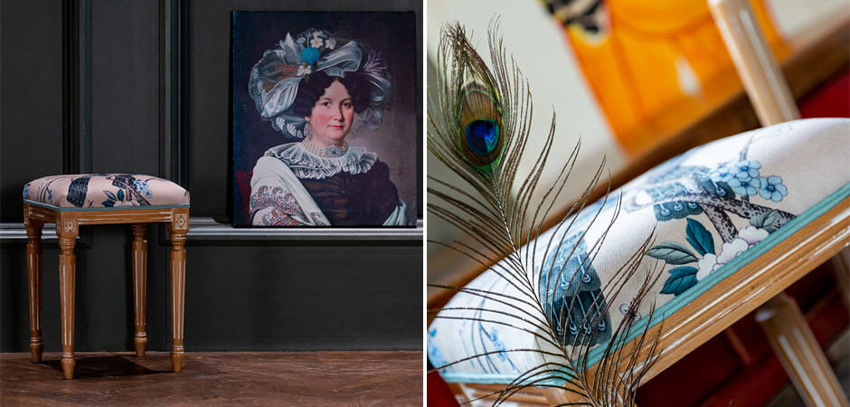 Вышитые синие павлины на банкетке являются воплощением роскоши, благородства и изысканности. Этот узор символизирует мудрость, красоту и величие. Их царственные перья и многогранность красок захватывают взгляд, перенося вас в волшебный театр, где каждый шаг и движение превращаются в элемент завораживающего спектакля.