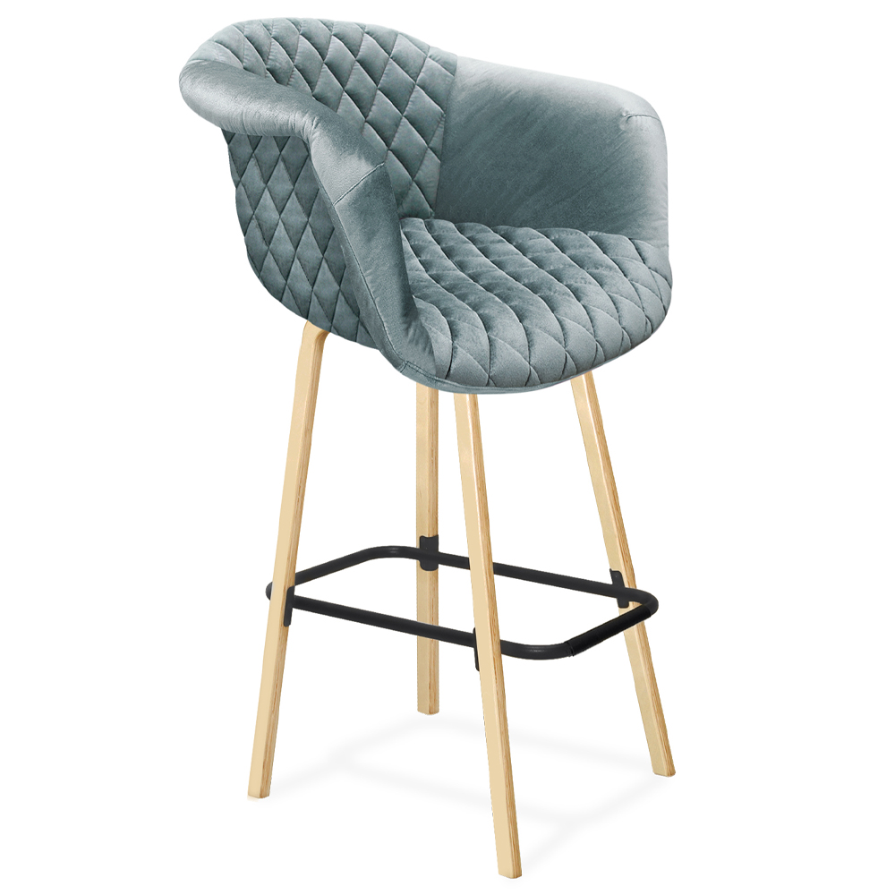 Барный стул со спинкой и мягкой обивкой с ромбами на 4-х деревянных ножках Голубой Велюр Ava Charm