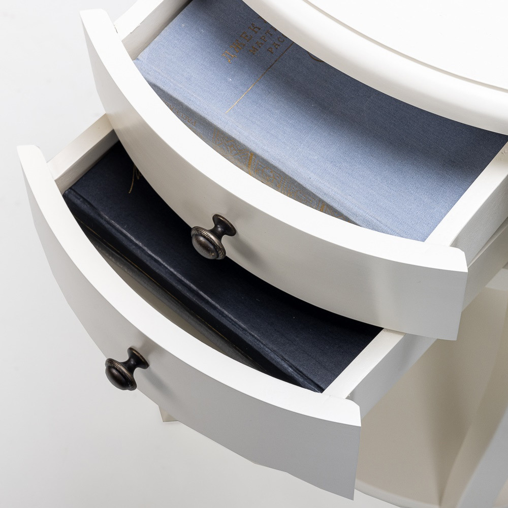 Элегантная тумба на фигурных ножках с двумя выдвижными ящиками в цвете слоновой кости и функциональной нижней полкой. Выполнена из массива и шпона бука. А значит долговечна и экологична - ее можно безопасно разместить в любом помещении вашего интерьера. Прекрасно подойдет всем любителям классического стиля или стиля Прованс. Данную модель вы можете приобрести не только из наличия, но и заказать в любом другом цвете.