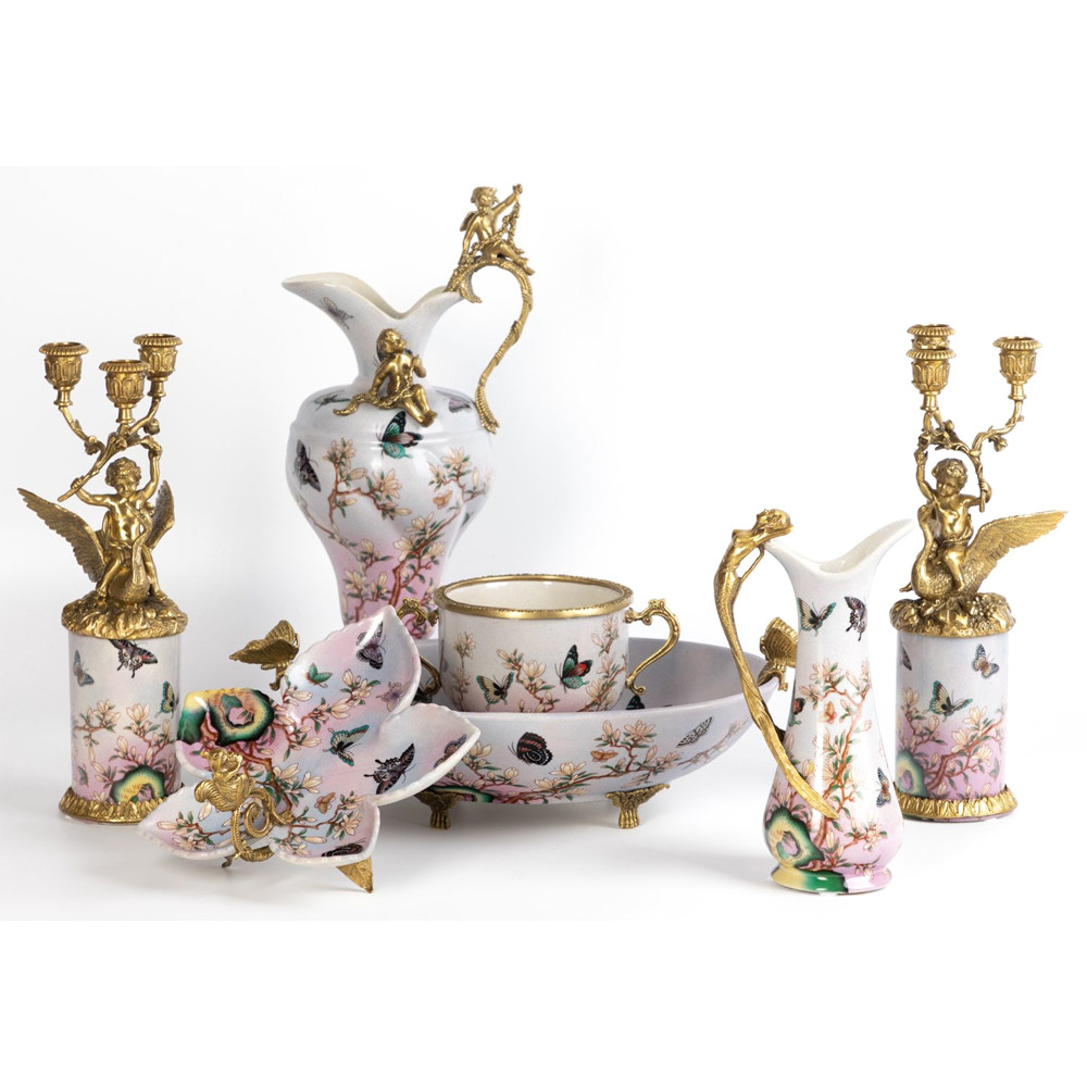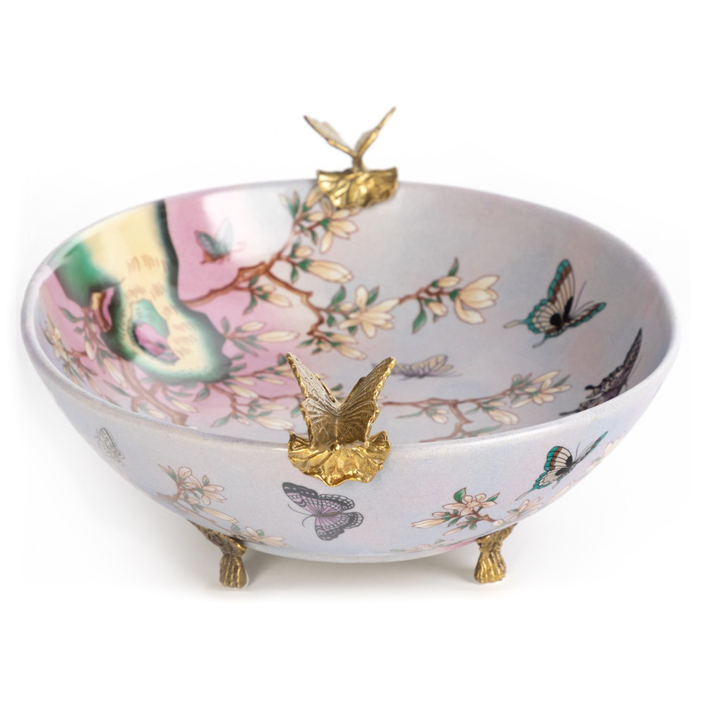 Блюдо, выполненное из фарфора с бронзовыми элементами. Уникальное изделие ручной работы. При производстве этих художественных изделий из фарфора с бронзой используются вековые традиции китайских мастеров. Видимые трещинки (кракелюры) делаются по уникальной технологии, что придает более благородный вид старинного изделия.