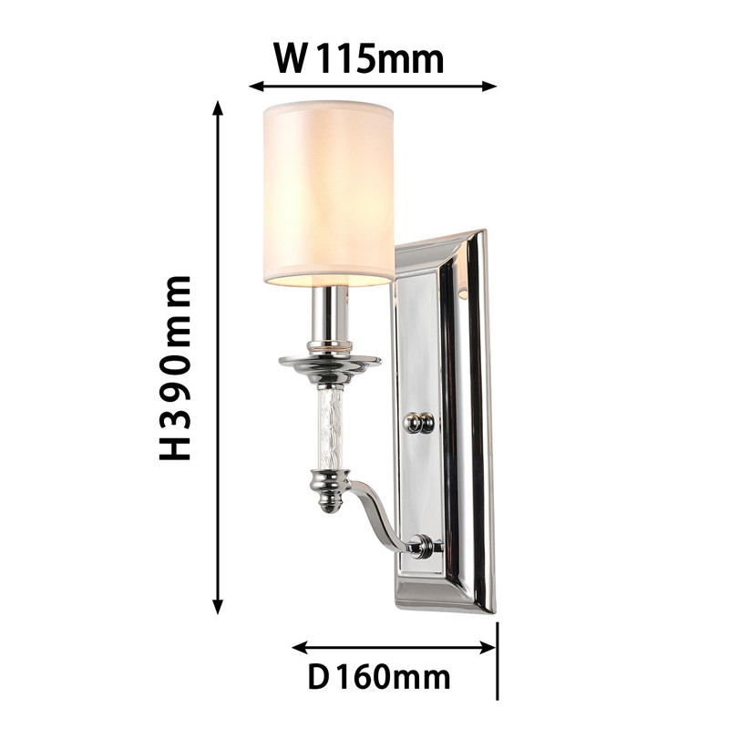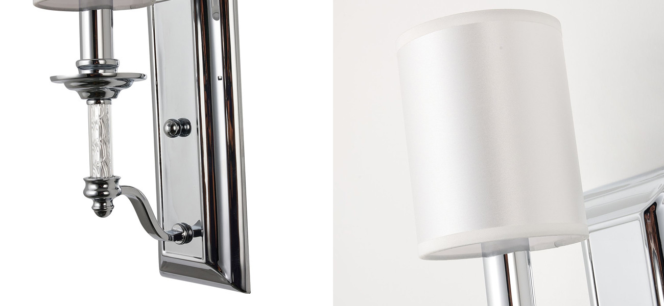 Каркас цвета хром, плафон из белой атласной ткани, декоративный элемент из прозрачного стекла.