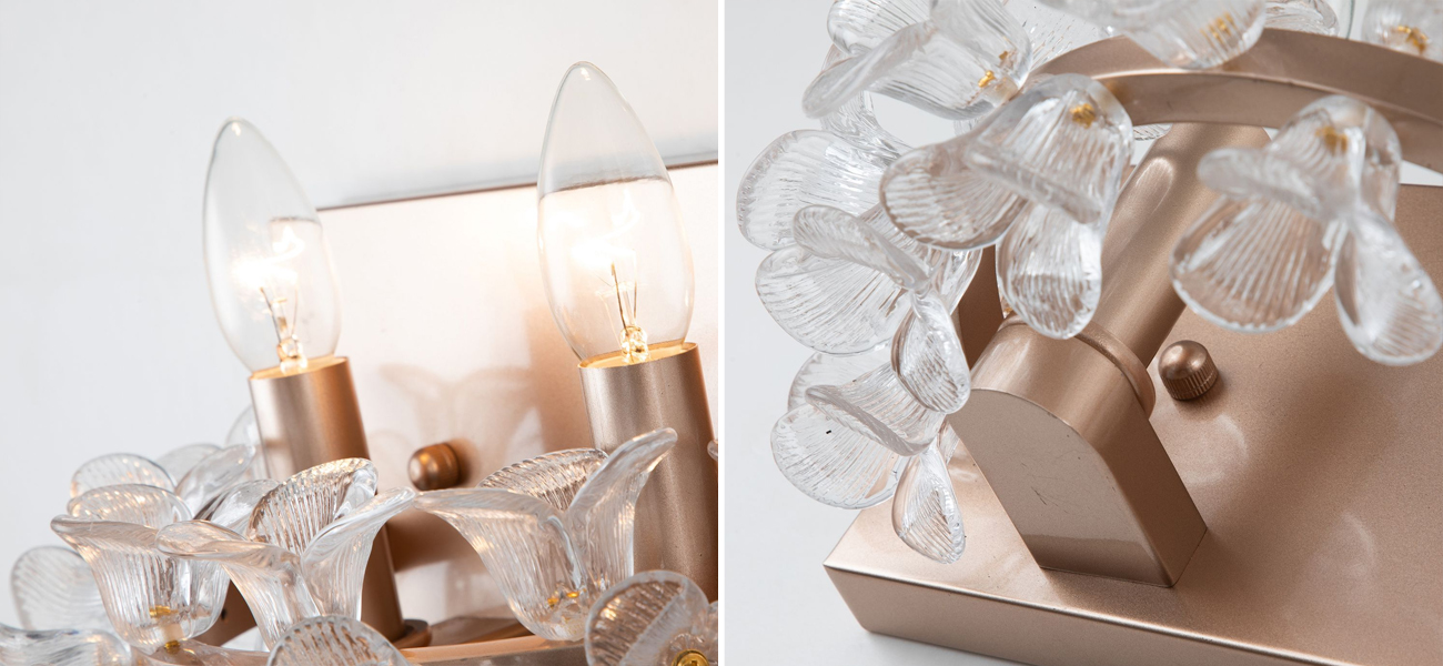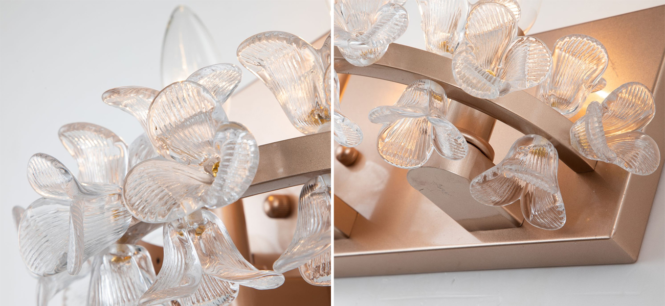 Каркас цвета жемчужного золота, декоративные элементы в виде цветов из прозрачного стекла.