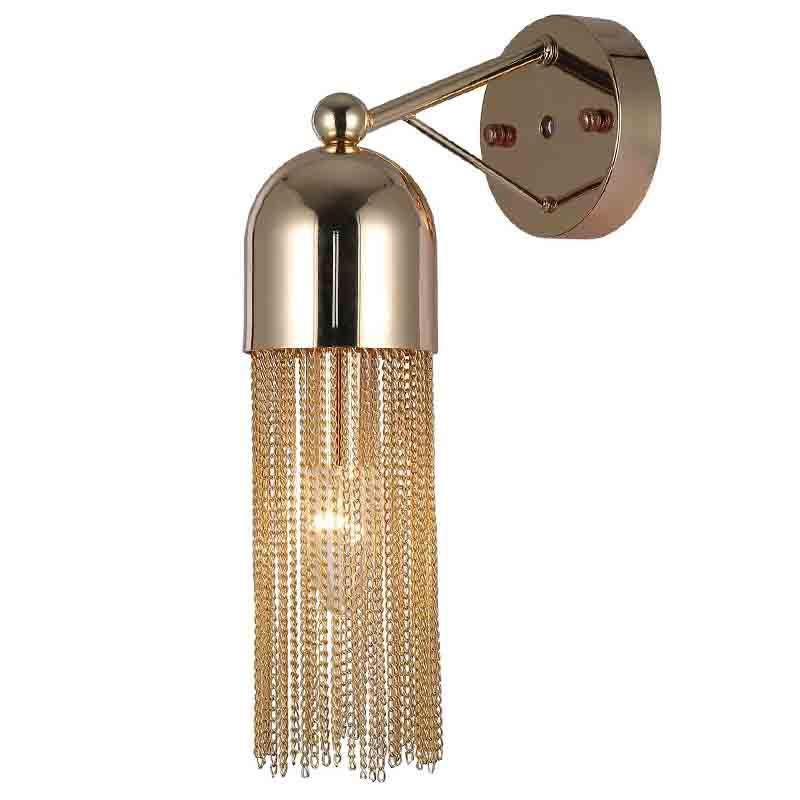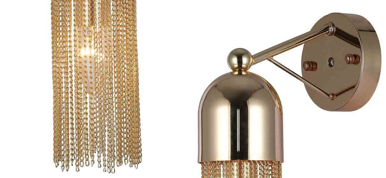Каркас золотого цвета, купол плафона украшен каскадом тонких золотых цепочек.