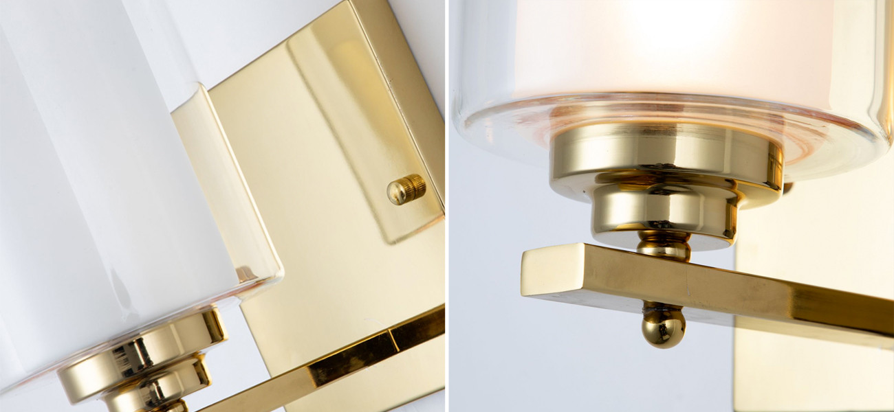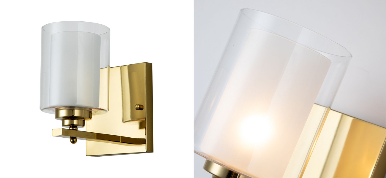 Каркас золотого цвета, внутренний плафон из белого стекла, внешний плафон из прозрачного стекла.