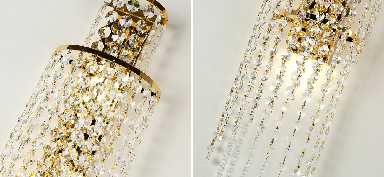 Каркас цвета светлого золота, плафон в виде объемного обруча состоит из прозрачных хрустальных восьмигранников.