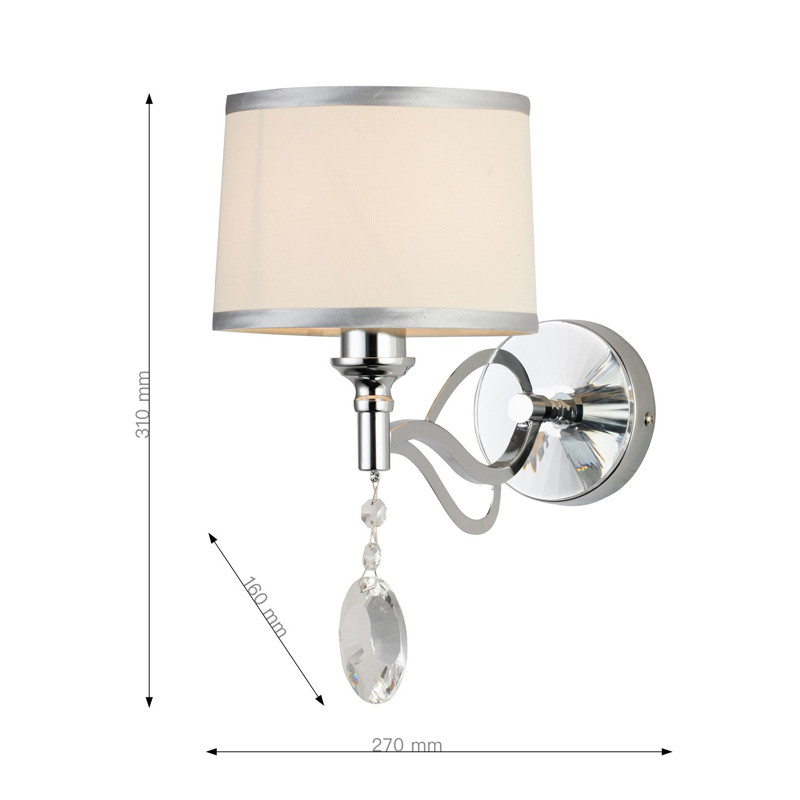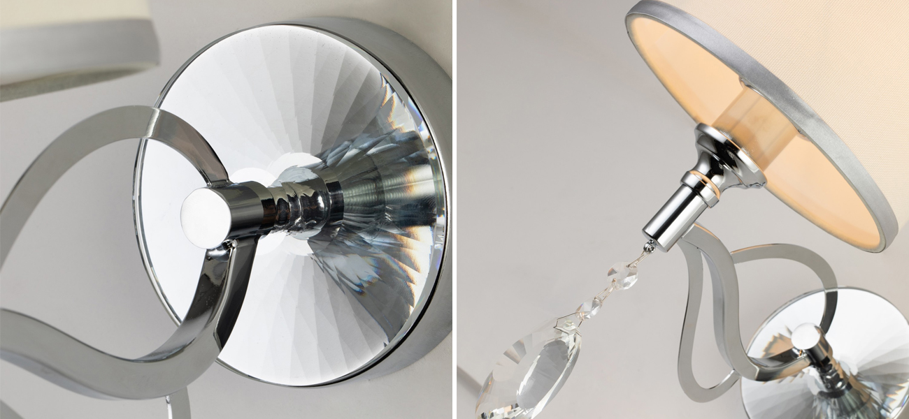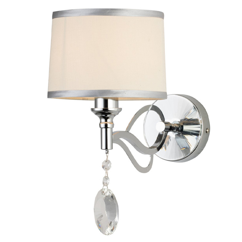 Каркас цвета хром, абажур из белой ткани с серебряной тесьмой, декоративный элемент из прозрачного хрусталя.