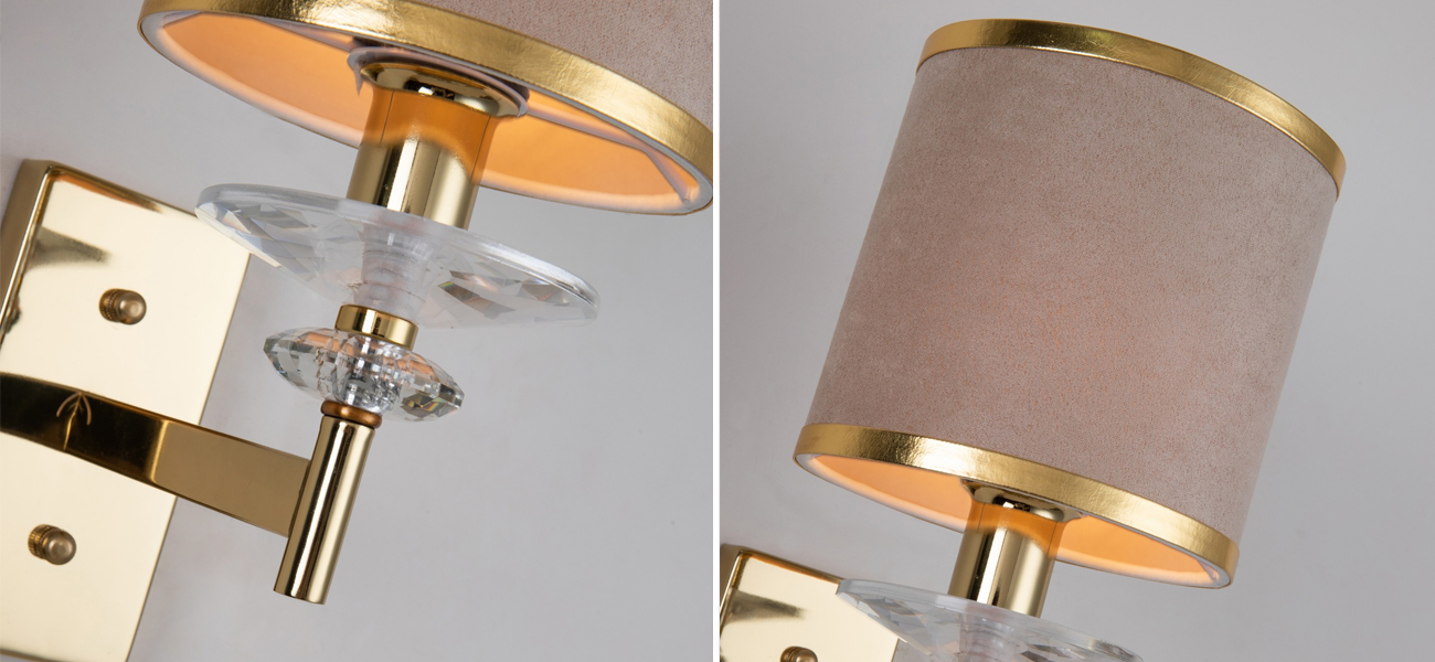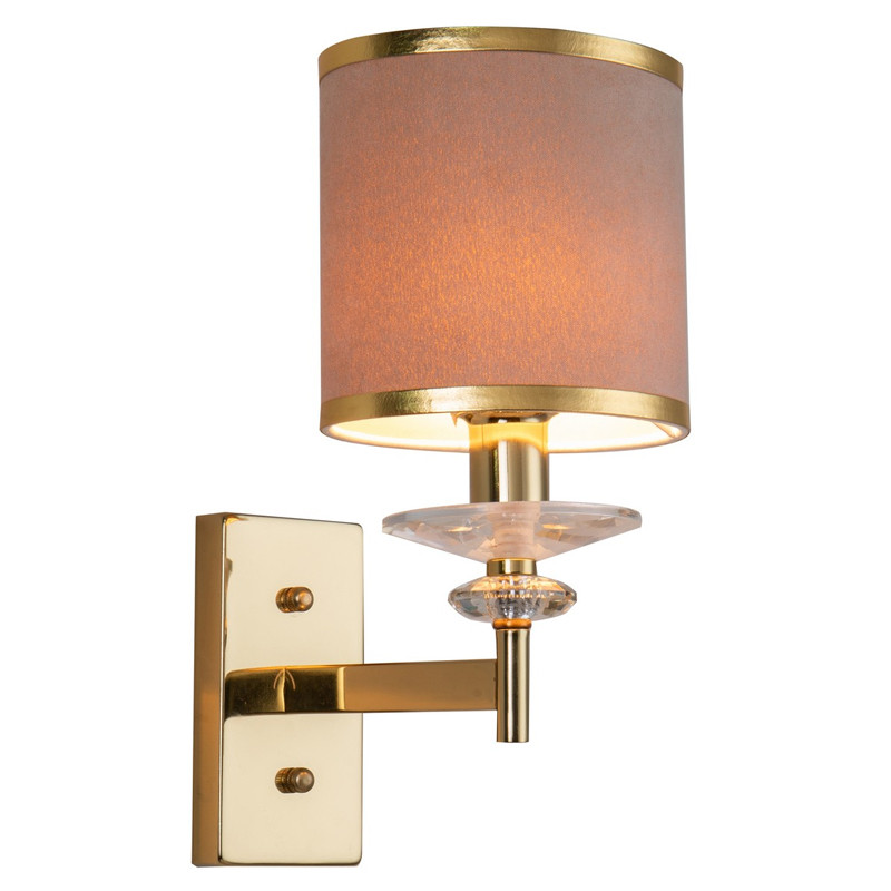 Каркас цвета латунь, абажур из бежевой бархатистой ткани с золотой тесьмой.