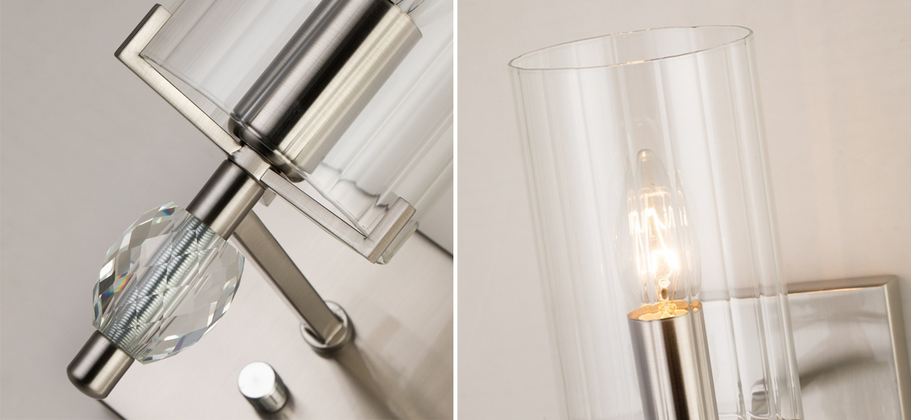 Каркас цвета никель, плафон из прозрачного узорного стекла, декоративный элемент из прозрачного хрусталя.