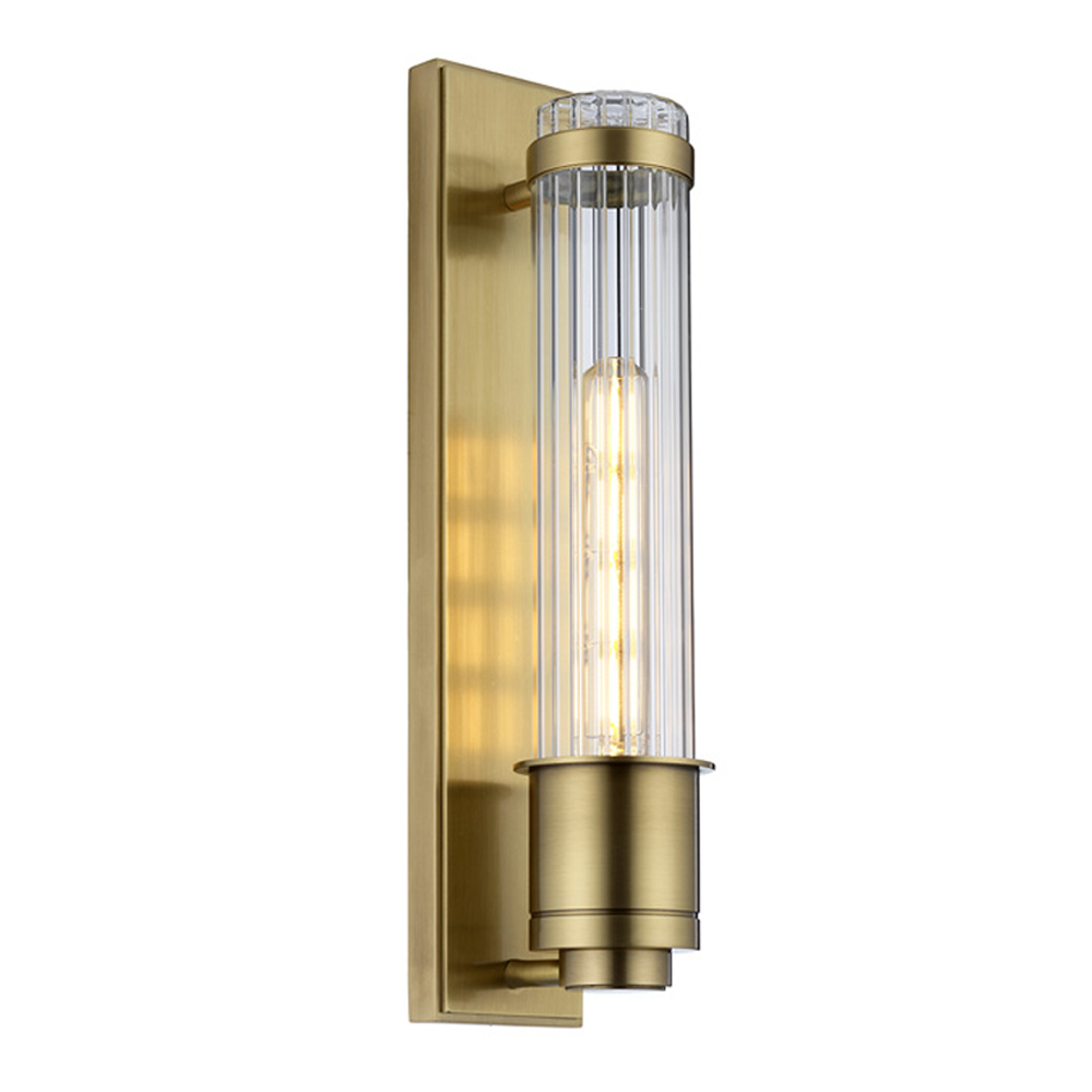 Бра Elstead Lighting QN-WELLINGTON1-AB. Винтажный стиль. Подходит для ванных комнат и любых других помещений. Удлиненный цельный стеклянный плафон. Рекомендуем сочетать с ретро лампами 1040-h. Основание выполнено в отделке - Состаренная латунь, полированный хром. Степень защиты IP44.