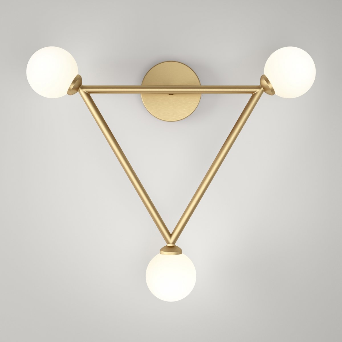 БРА ARETI TRIANGLE WALL из коллекции ATELIER ARETI. Светильник имеет треугольную форму и три стеклянных матовых шарообразных плафона, расположенных на равноудаленном расстоянии друг от друга. Представлена в золотом цвете. Модель эффектно впишется в окружающую обстановку и станет одним из главных декоративных элементов интерьера.