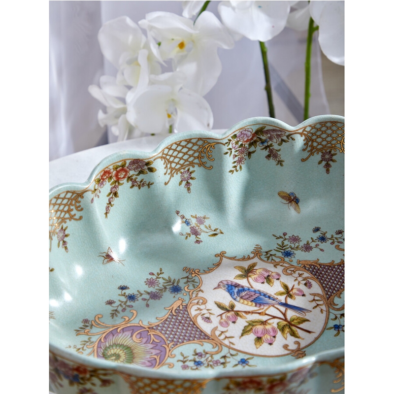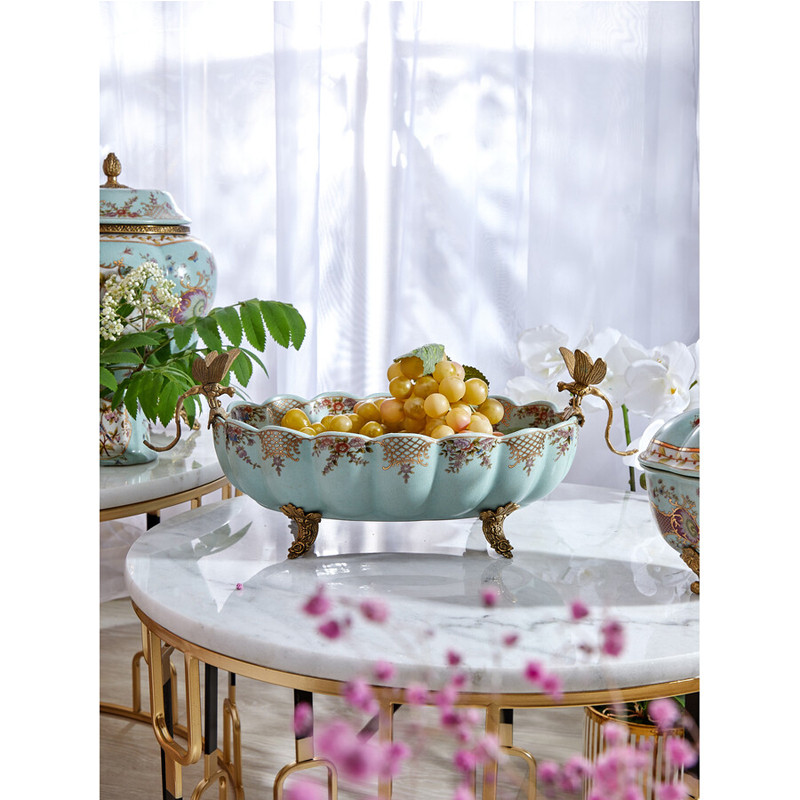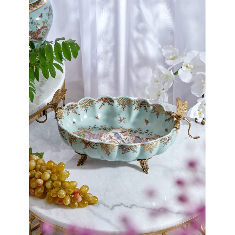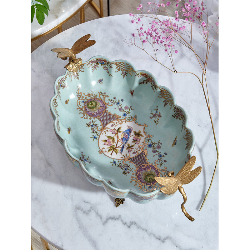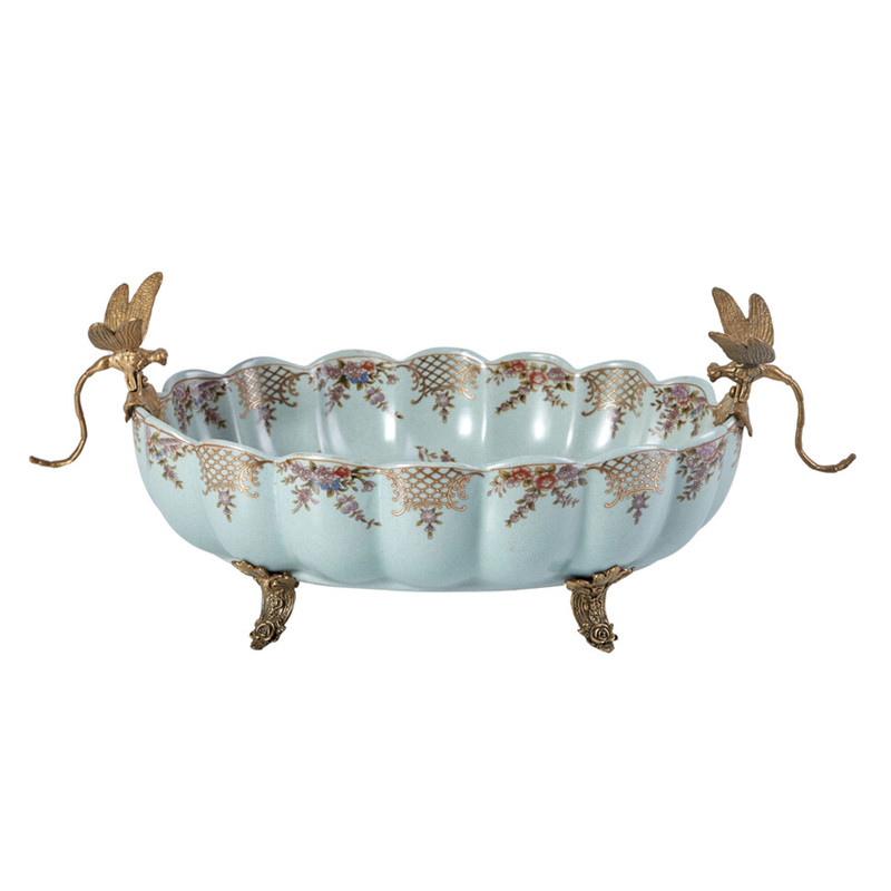 Чаша из голубого фарфора на бронзовых ножках с рисунком цветов и фигурками стрекоз Blue Garden