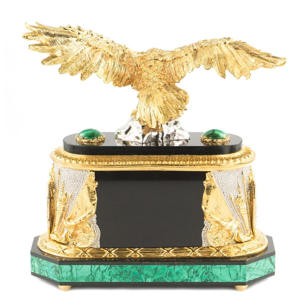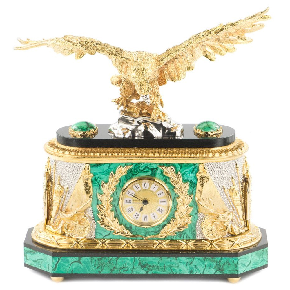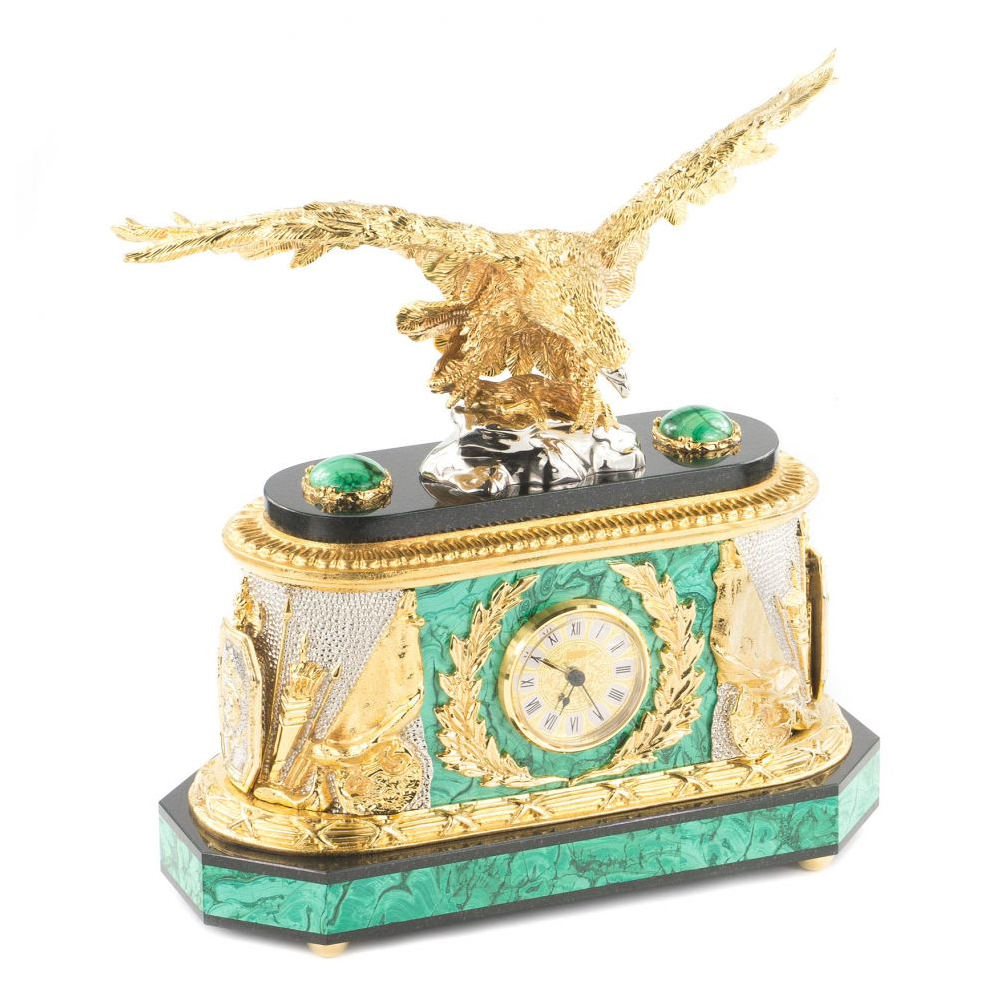 Часы настольные из натурального камня Малахит с декором в виде орла в подарочной коробке Eagle Stone Clock