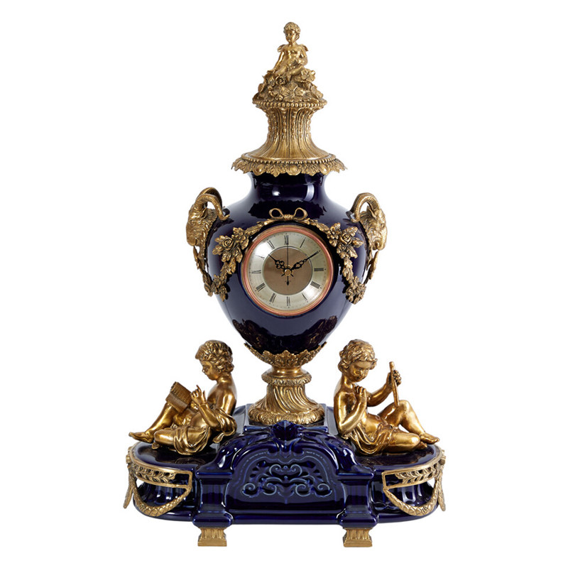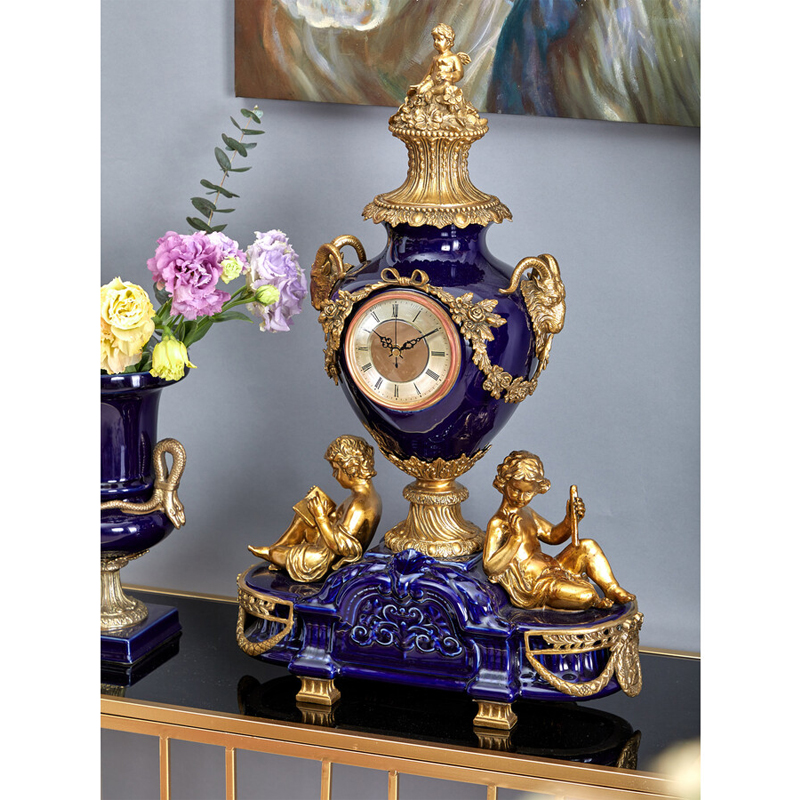 Часы настольные из темно-синего фарфора с бронзовыми фигурками и декоративными элементами Eden Garden