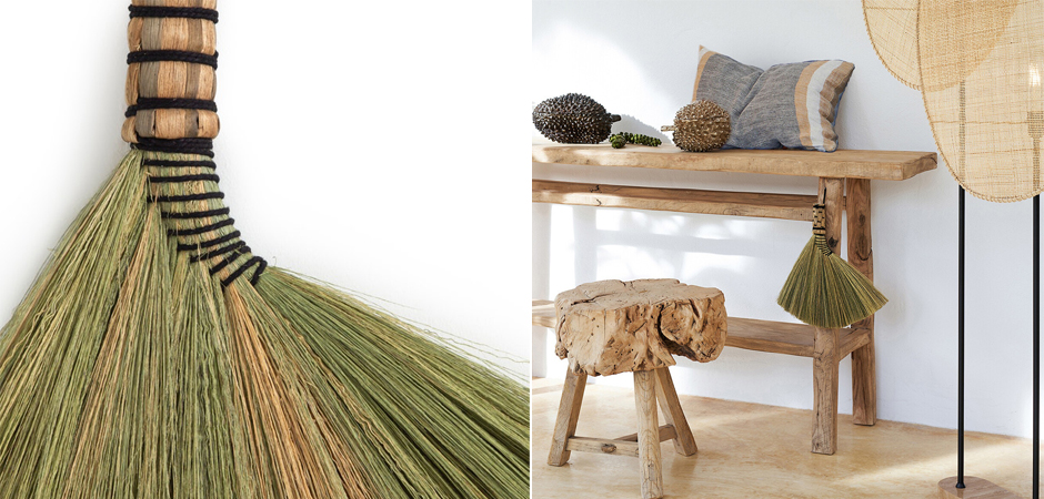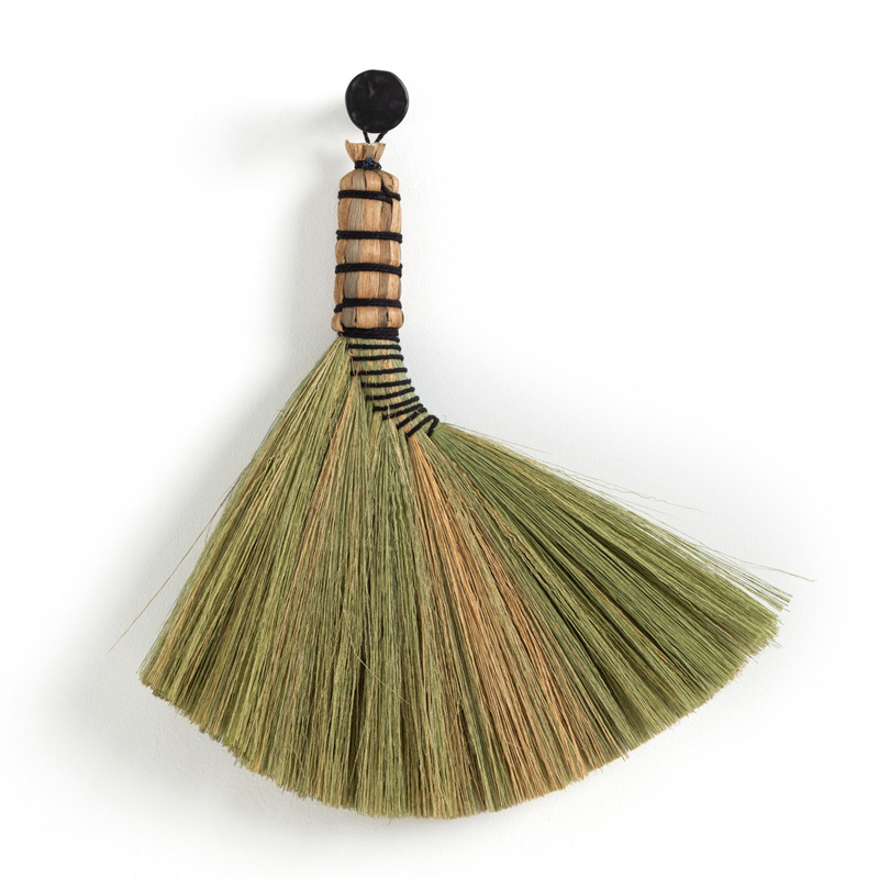 Декоративная метла с плетёной ручкой из манильской пеньки, ворс из ткани район.