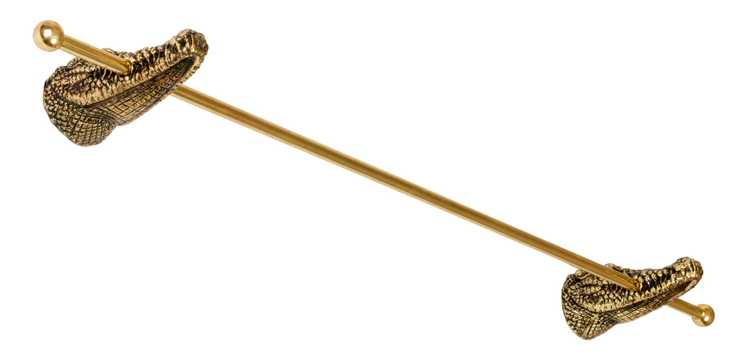 Две латунных скульптуры крокодилов, держащих в пасти латунный прут с латунными шариками по краям. Стильный и нужный акссесуар в ванной комнате. Монтаж на стену осуществляется при помощи сантехнических шпилек и установочных винтов. Изделие покрыто защитным составом. Необходимый крепеж идет в комплекте |