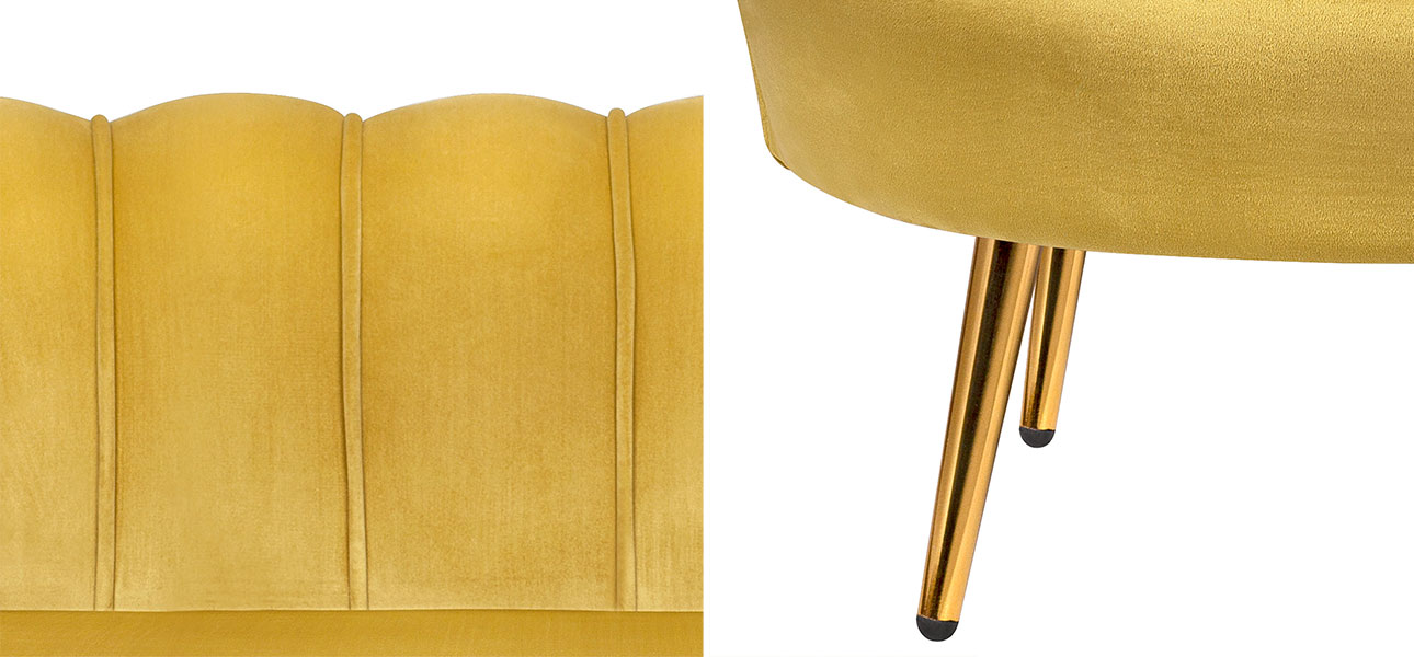 Обивка выполнена из качественной ткани желтого цвета, которая не теряет своего внешнего вида после длительной эксплуатации. Каркас изготовлен из прочного дерева и металла, благодаря чему диван экологичен и устойчив к коррозии.