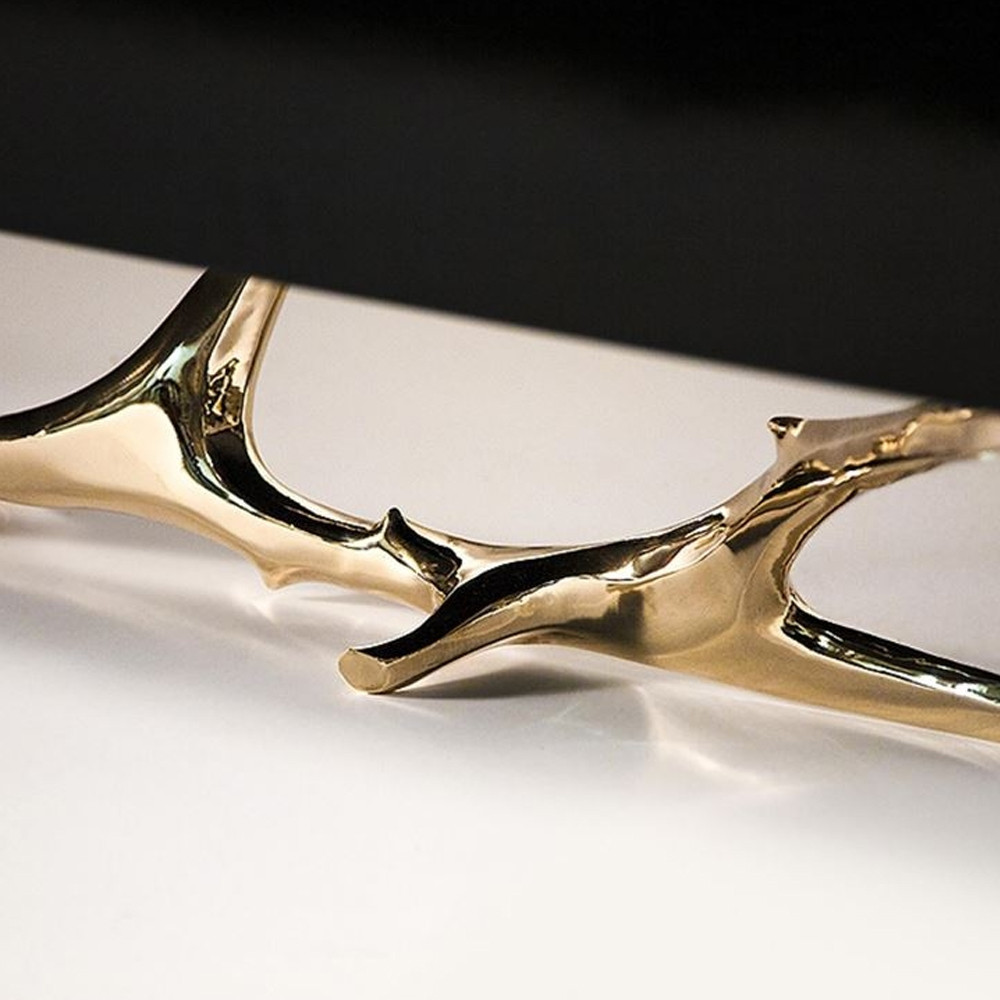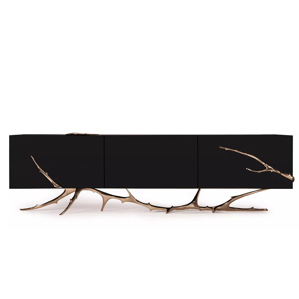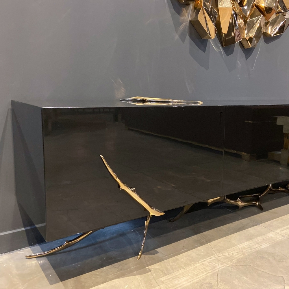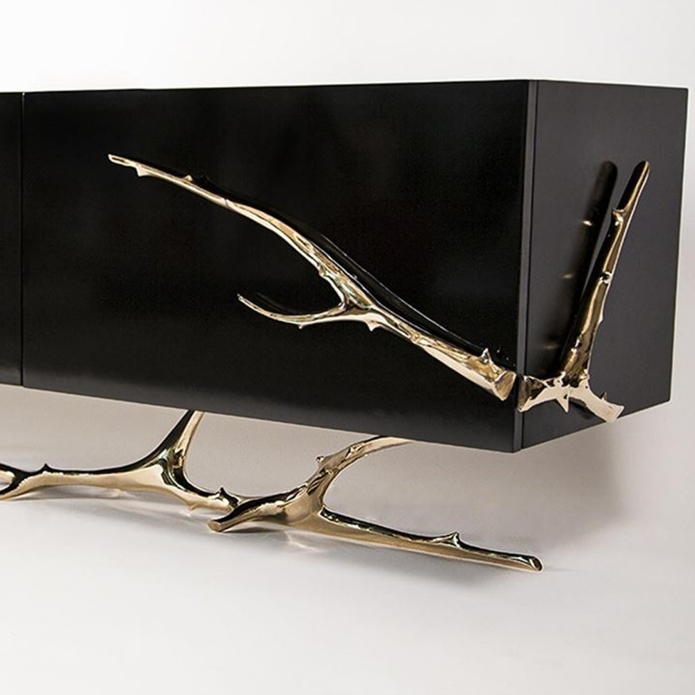 Дизайнерский комод чёрный глянцевый с основанием в виде золотых ветвей Meta Credenza
