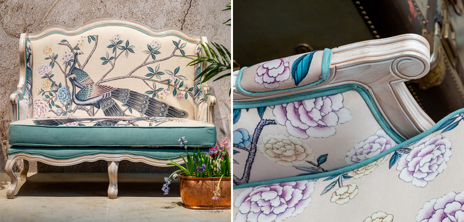 Его обивка украшена роскошными павлинами и сочными плодами гранатового дерева, которые придают уникальный вкус и настроение всему пространству.