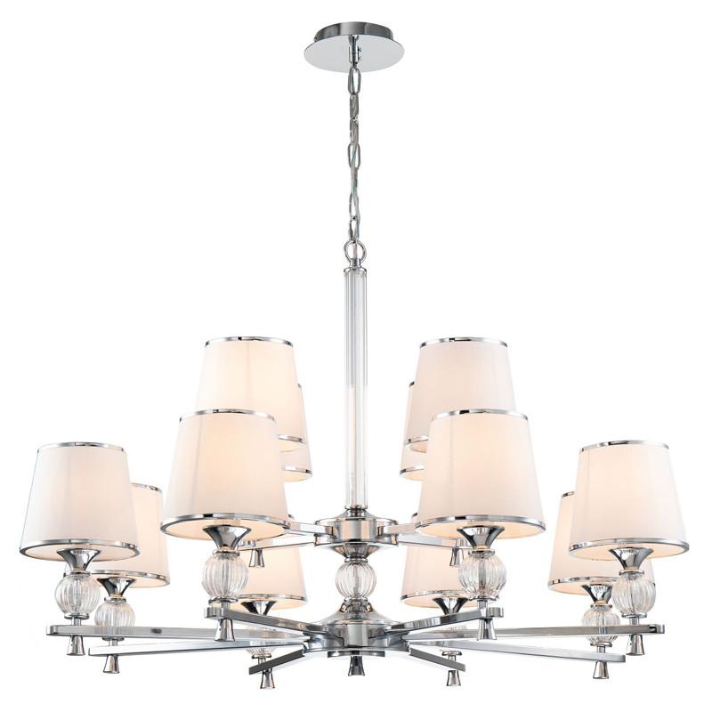 Каркас цвета хром, плафоны из белой ткани с серебристыми лентами, декоративные элементы из прозрачного стекла.