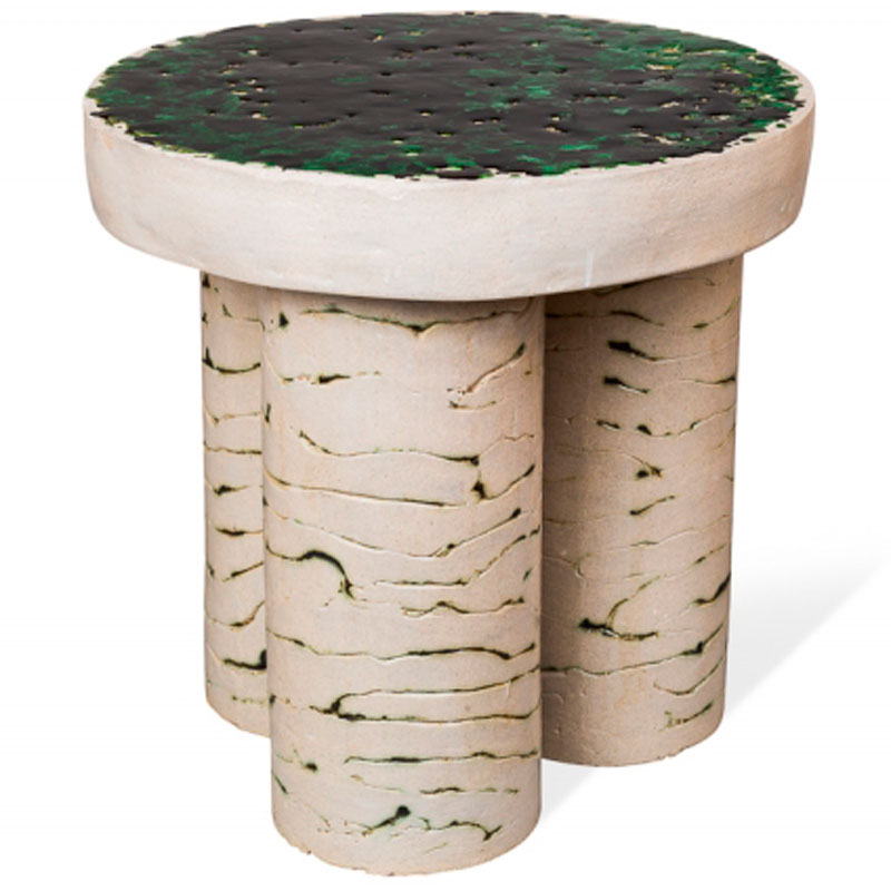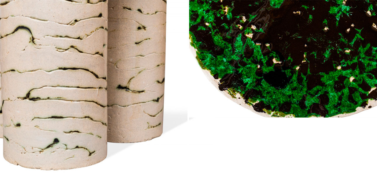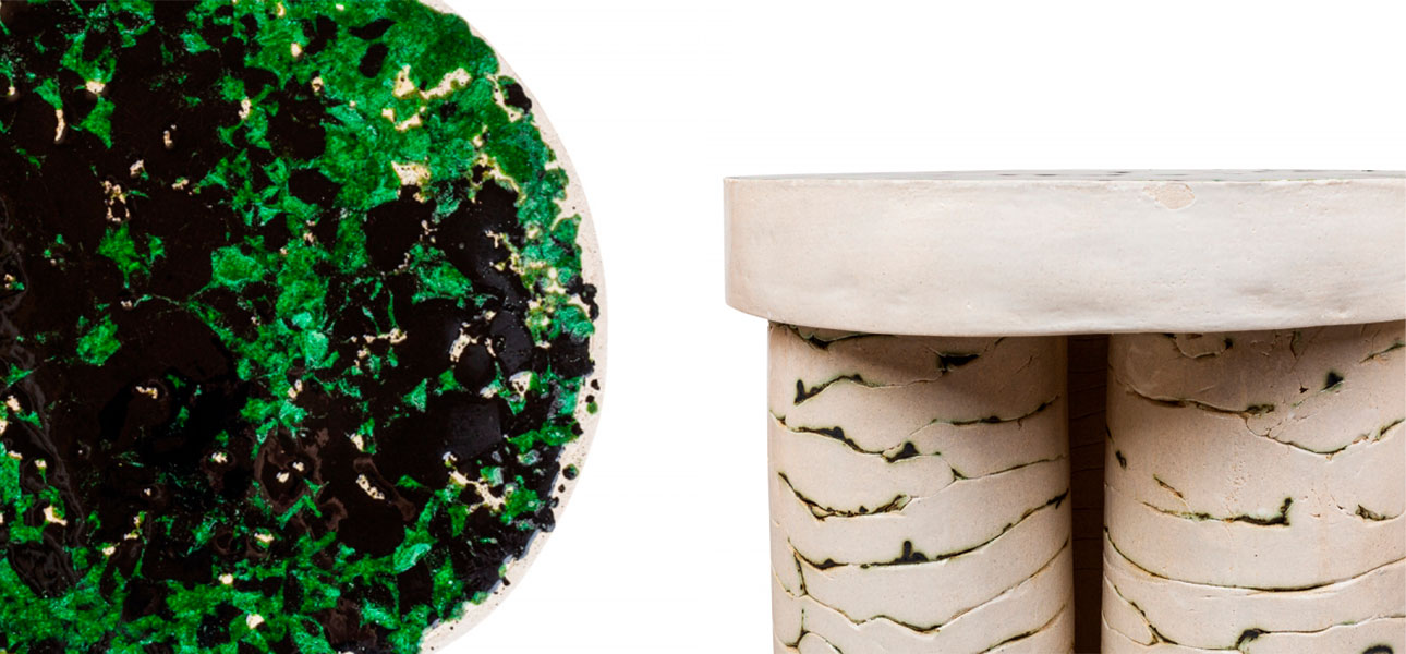 Столешница столика покрыта расплавленным черно-зеленым стеклом, которое символизирует лес, динамику природы, ее изменения и трансформации.