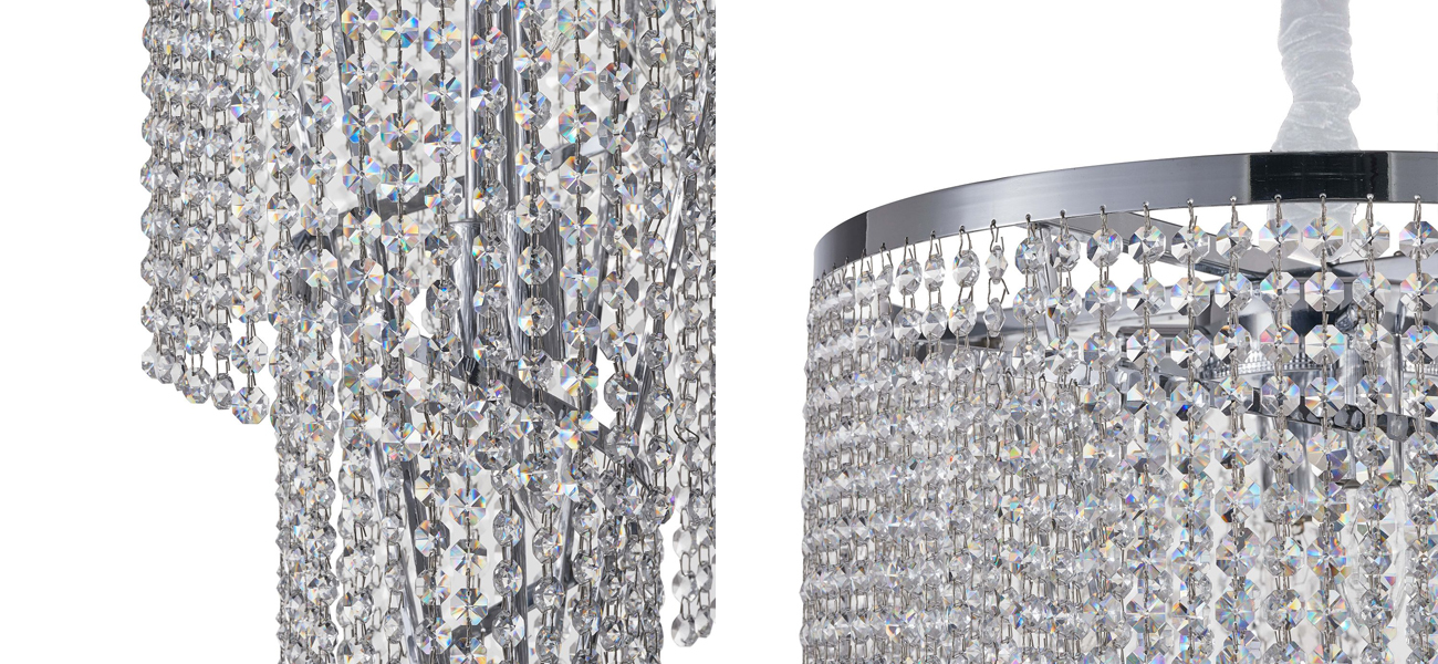 Корпус изделия изготовлен из надежного металла и покрыт серебристым слоем, который предотвращает появление ржавчины – даже в условиях влажной среды. А хрустальные подвески хорошо отражают от себя свет ламп, увеличивая освещение вдвое.