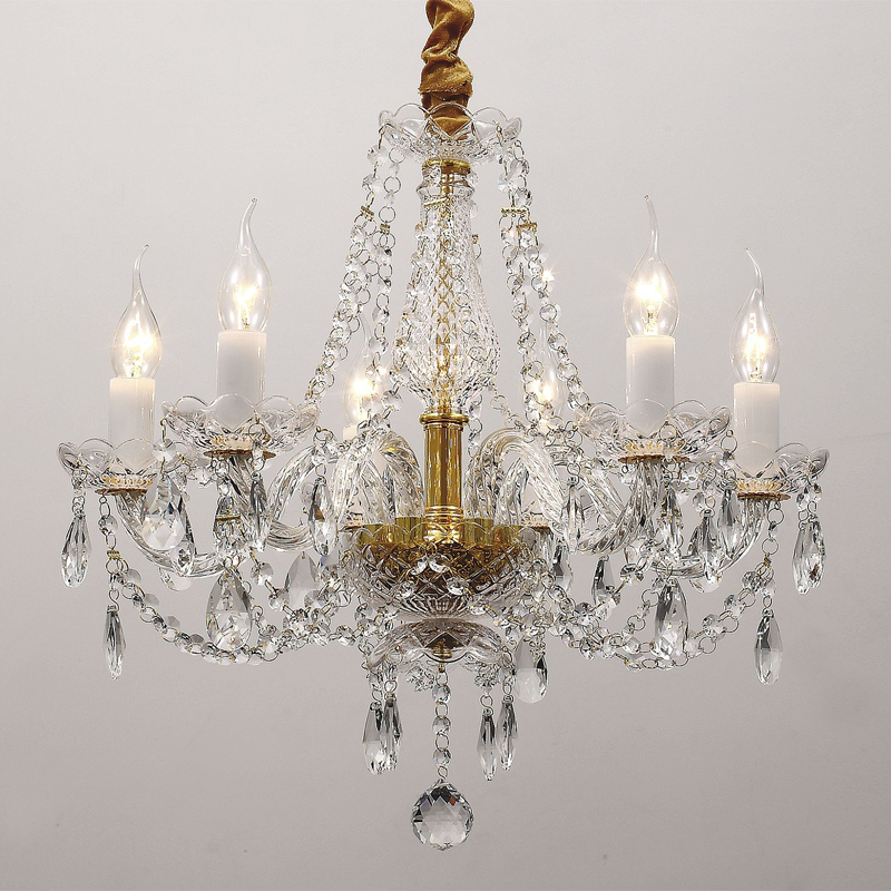 Арматура золотого цвета, хрусталь высшего качества и стеклянные рожки и блюдца прозрачного цвета.