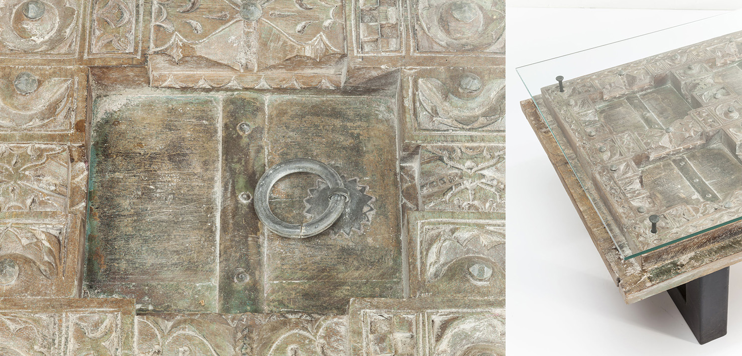 Он выполнен в виде винтажной индийской двери, украшенной традиционными узорами. Столешница столика изготовлена из стекла, а основание – из стали.