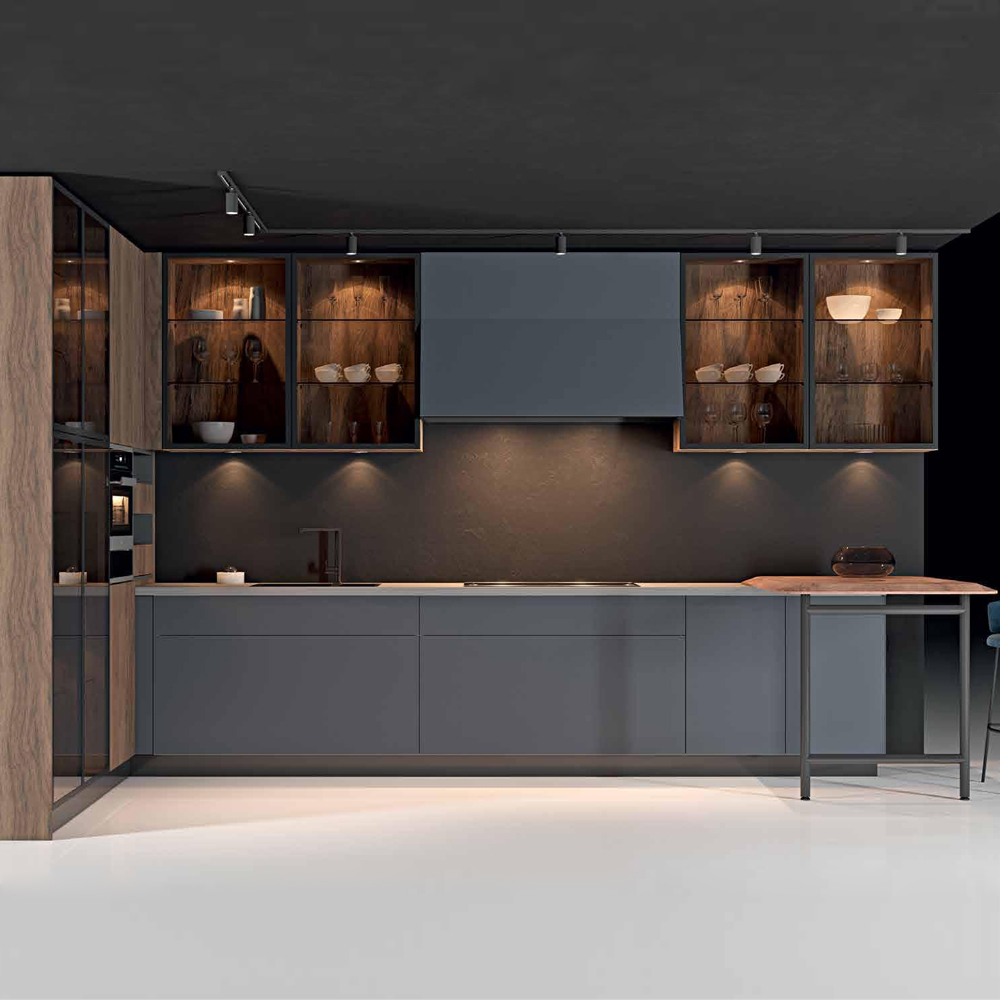 Комбинированный кухонный гарнитур сине-серого цвета с фасадом под дерево Benjamin Kitchen Set