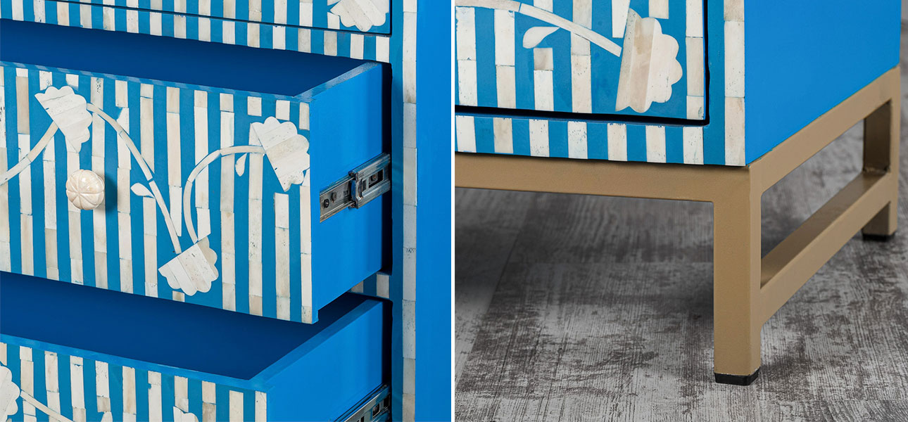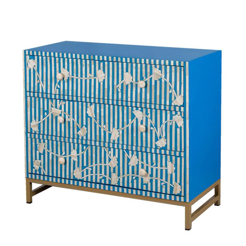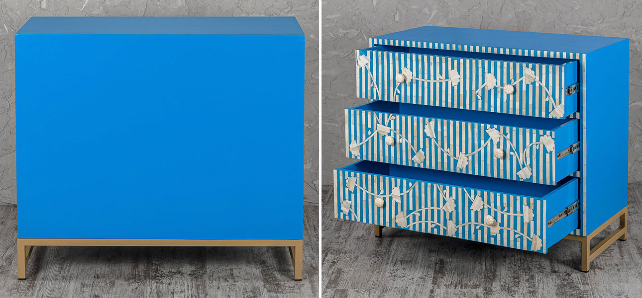 Если купить комод синий инкрустация костью Blue Flowers, он будет оснащен тремя ящиками для удобного хранения ваших вещей.