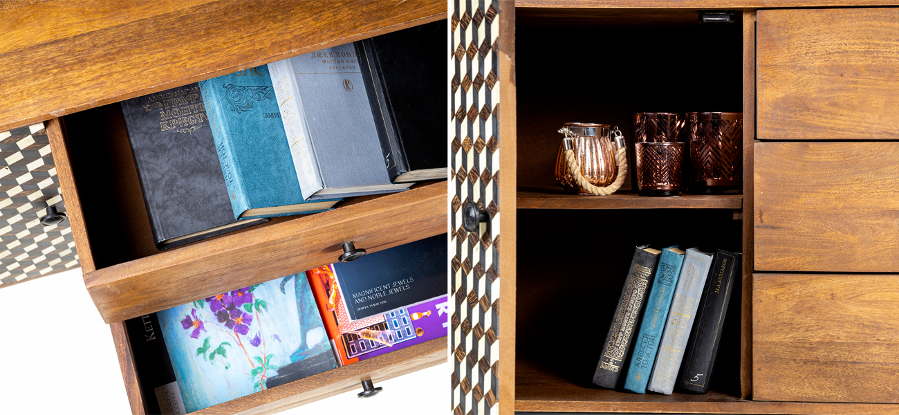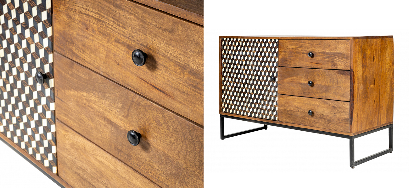 Но самое главное в этом комоде – это его “компактные” габариты. Поэтому, можно купить комод из натурального дерева Bone Inlay 115 см для любого пространства, при этом, разместить в нем все свои вещи, от одежды до книг и документов.