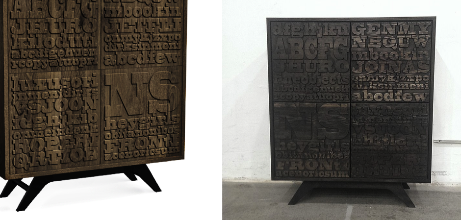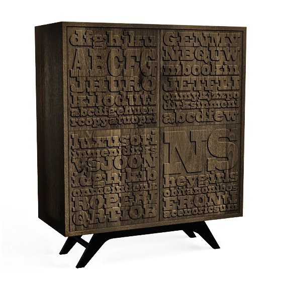Комод с дверками из дуба, украшенными рельефной шрифтовой композицией. В базовом варианте дверки с петлями Push2Open, возможно изготовление в любой конфигурации дверок и ящиков. Дополнительно возможна окраска корпуса эмалью.