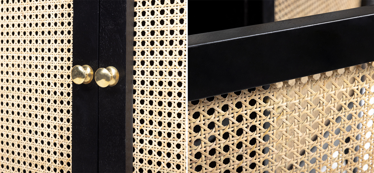 Массив манго гарантирует прочность и долговечность комода, а ротанговые вставки – добавляют легкости и воздушности. Сетчатые дверцы позволяют свободно циркулировать воздуху, препятствуя накоплению пыли внутри мебели.