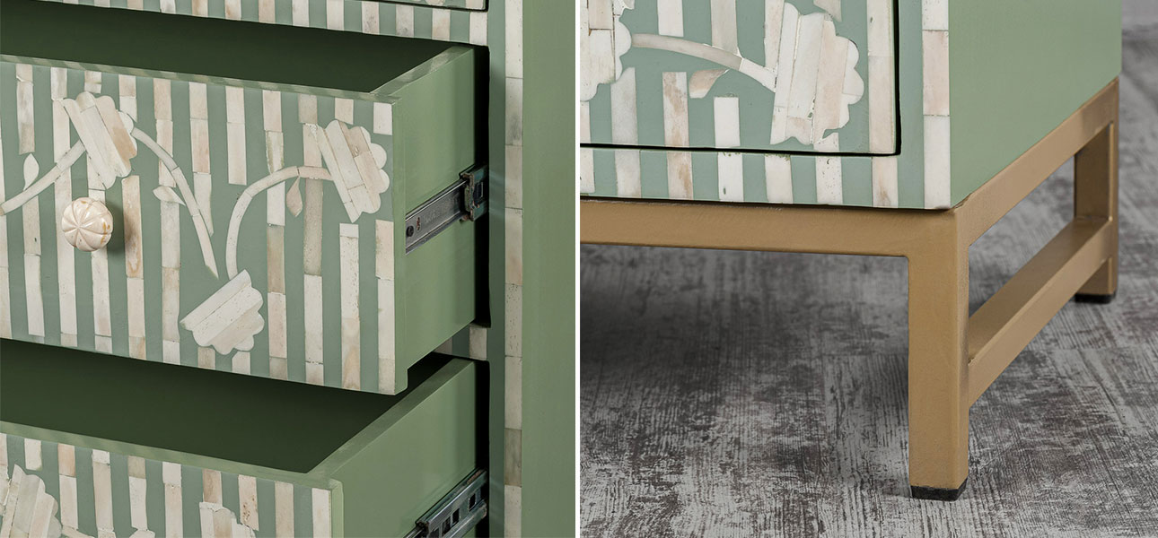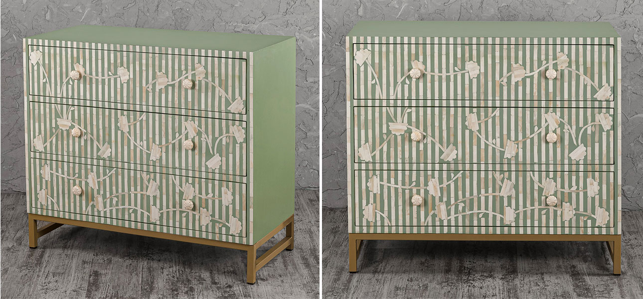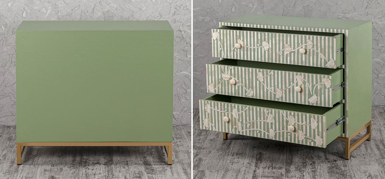 Купить комод зеленый инкрустация костью Green Flowers – это выбрать мебель как для спальни, так и для гостиной, рабочего пространства, создавая уютную атмосферу.