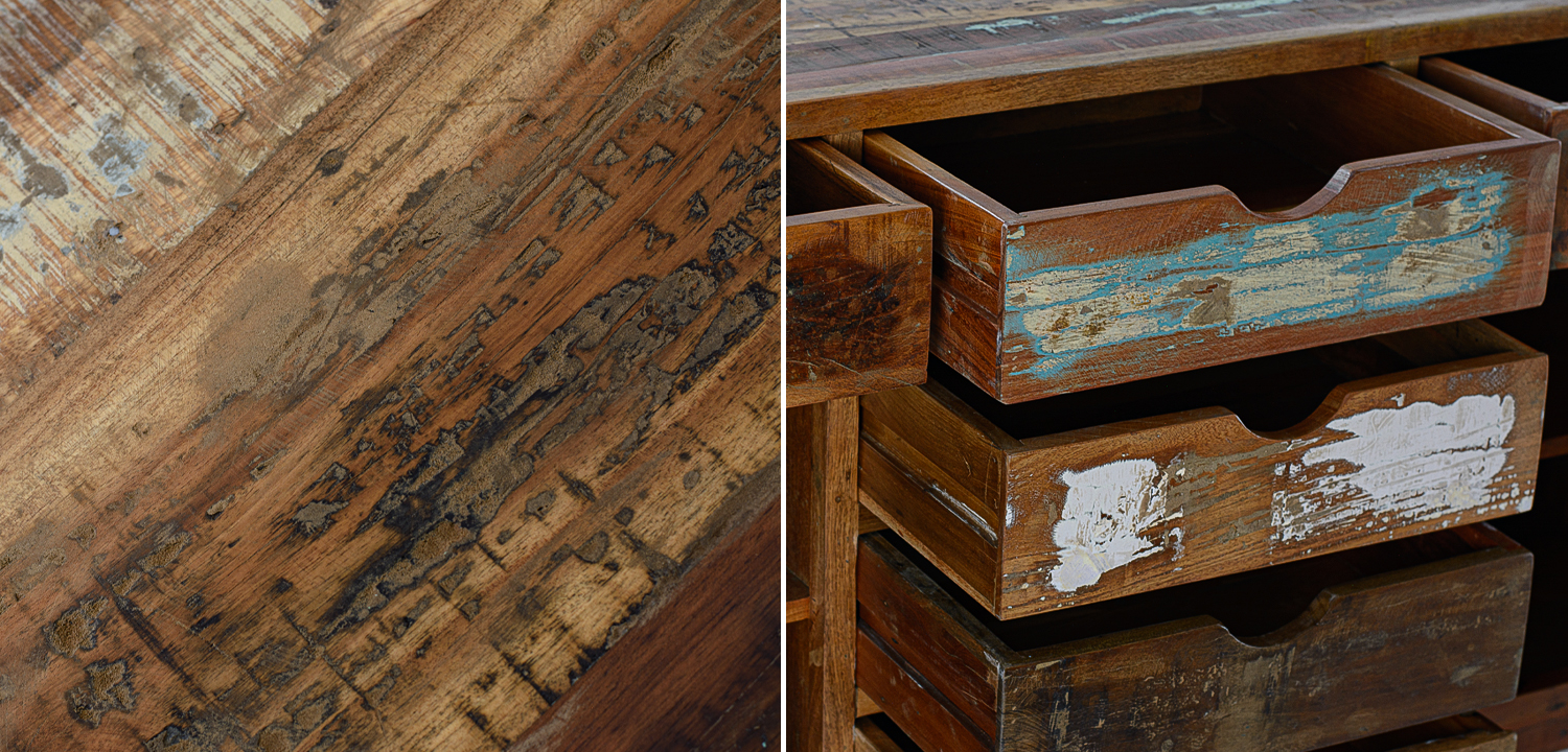 Каждый предмет интерьера, выполненный из антикварной (восстановленной) древесины, хранит в себе частицу истории. Крыши и окна старинных домов, колониальные ворота и двери, переходные мосты, рыбацкие лодки "перерождаются" в мебель для наших коллекций. Кроме истории, восстановленная древесина имеет более плотную структуру, благодаря этому после прохождения специальной обработки создаются изделия неподвластные влиянию времени. Каждый предмет уникален в силу особенностей сырья, используемого при производстве. Фактура, общий цвет и общий выкрас, дизайн остаются неизменными, но особенности отделки тиражировать невозможно, так как они не наносятся вручную, а являются частью истории сырья.