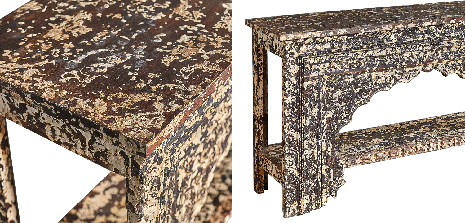 Tejas из тикового дерева с резными и состаренными элементами – представляет собой уникальное произведение искусства в сфере мебели.