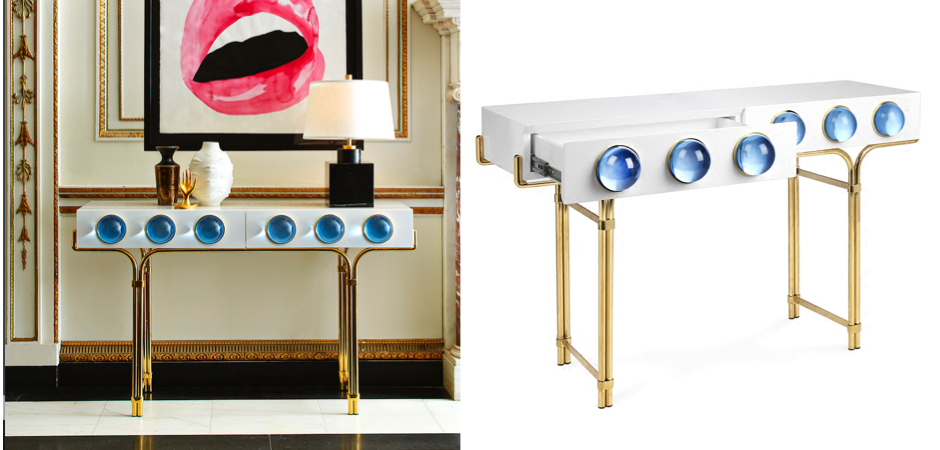 GLOBO CONSOLE – это реверанс в сторону Нео-Мемфиского стиля, которому присуща полная свобода самовыражения и уход от любых канонов. Джонатан Адлер вдохновлен был на создание этой чудо-консоли любимым своим зданием - Всемирным торговым центром, точнее его основанием, нижними этажами; где прослеживаются такие же похожие латунные извилистые линии, соблазняющие и притягивающие своим блеском. Кабошоны из акрила добавляющие еще больше бликов и изящества, как будто, нанизаны на каменную столешницу, обрамляемую латунными ножками. Сравнить можно с кольцом высокого качества, при создании которого, много было проведено кропотливой работы.