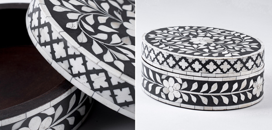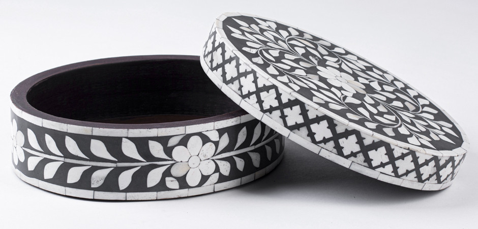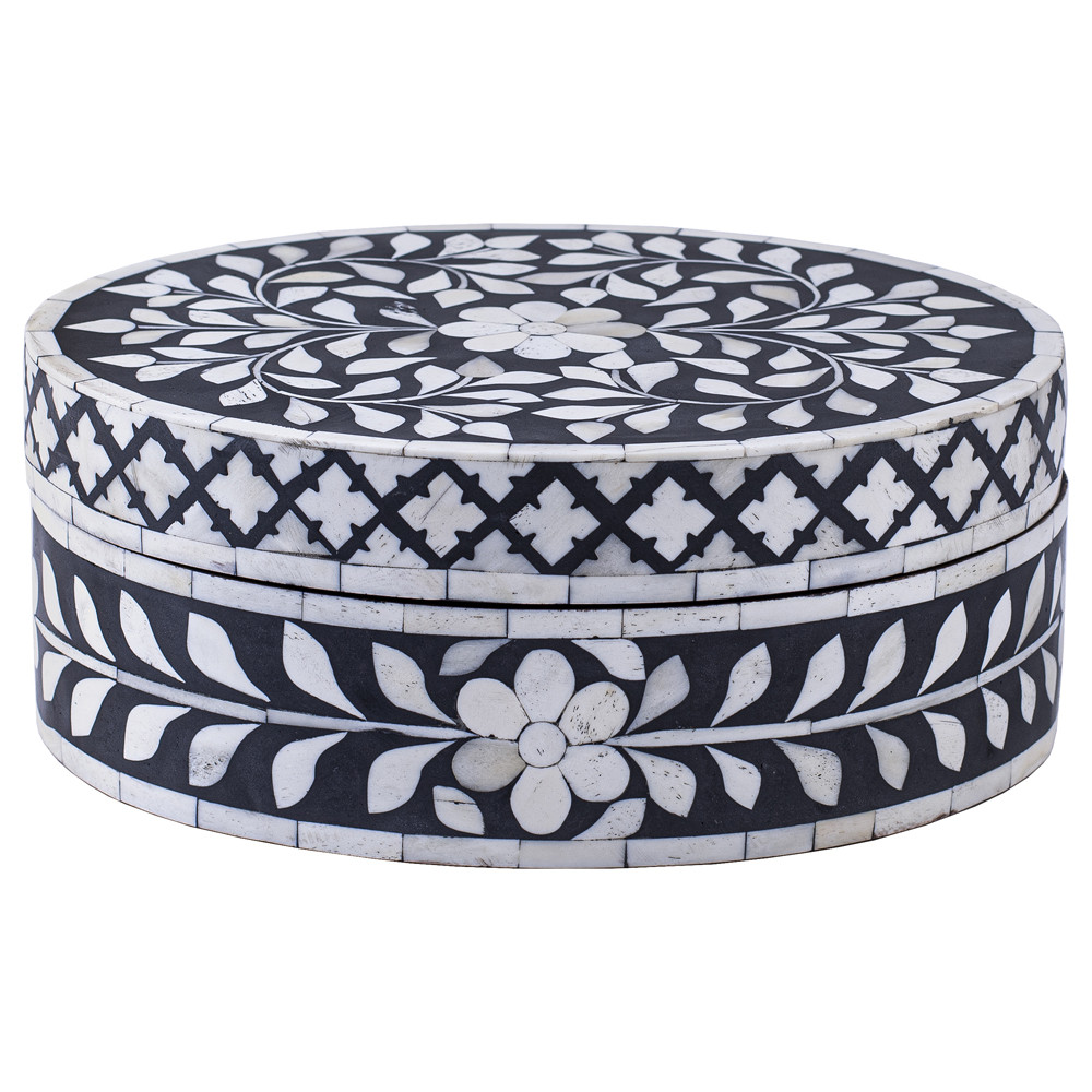 Круглая черная шкатулка инкрустация кость