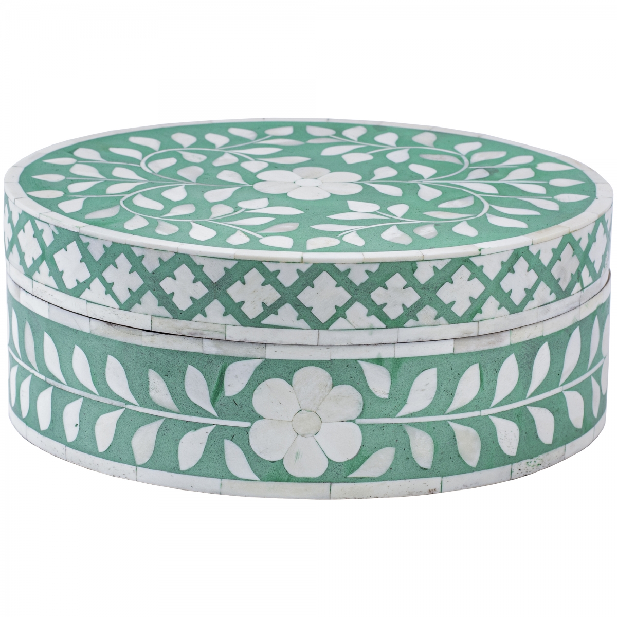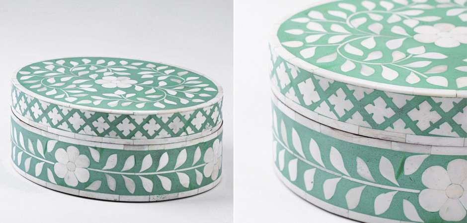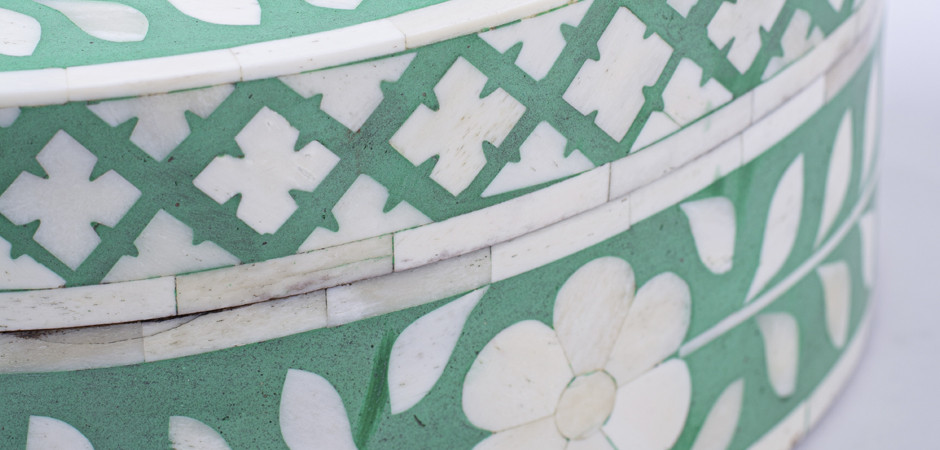 Круглая зеленая шкатулка инкрустация кость
