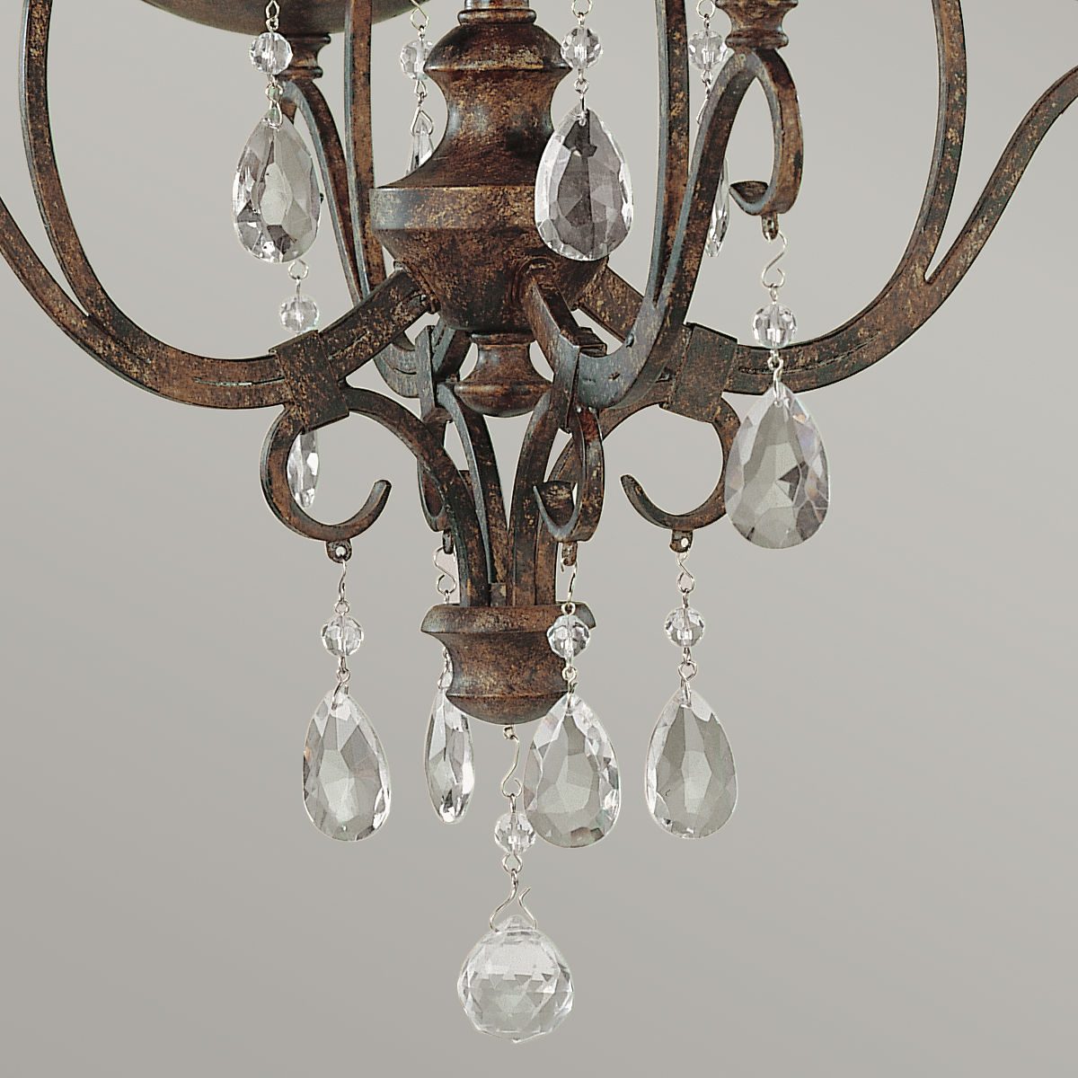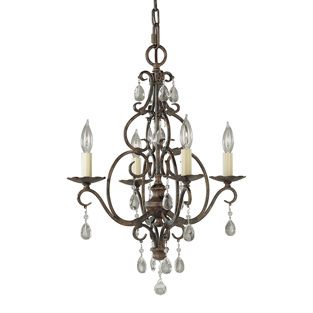 Люстра Elstead Lighting FE-CHATEAU4. Вдохновлено архитектурой великих замков на юге франции. Завитки из трубочек квадратного сечения создают лирическое настроение и гармонируют друг с другом. Подвески из оптического стекла. Основание выполнено в отделке - Бронза. Можно использовать при освещении гостинной, кухни, спальни, столовой. Поставляется с цепью длиной 1524 мм