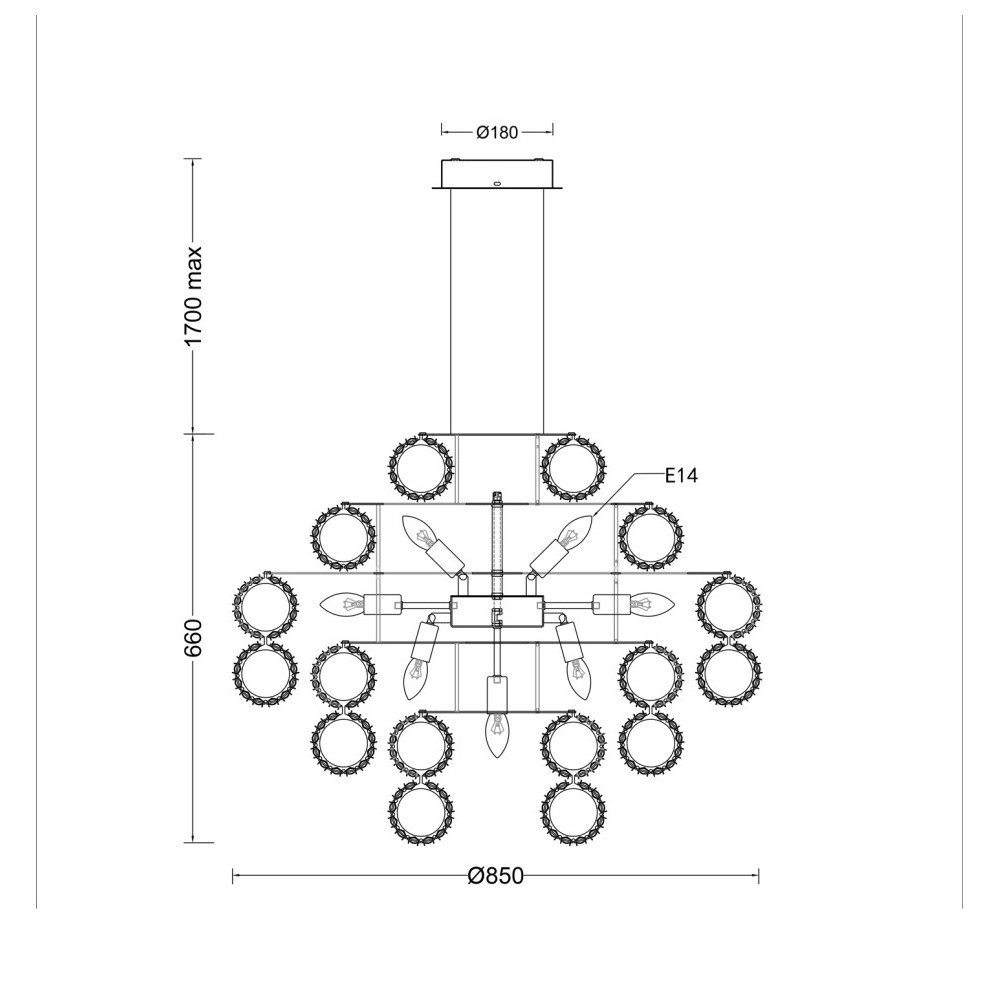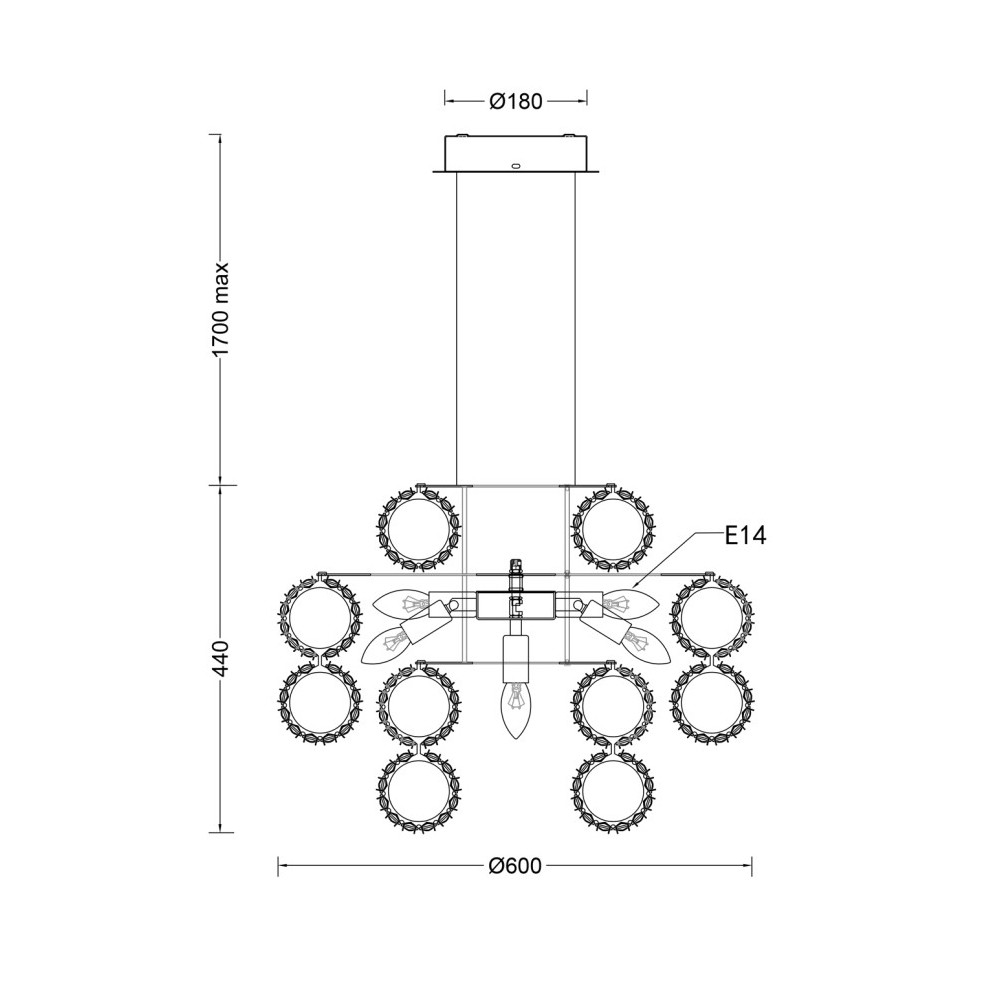 Высота min 44 см, Высота max 230 см, Диаметр 60см - 13 ламп, Диаметр 85см - 25 ламп
