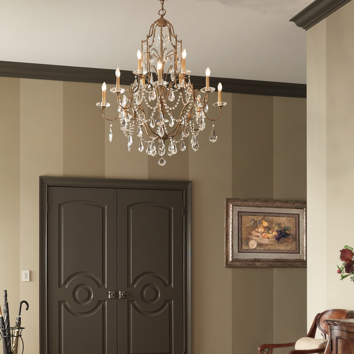 Люстра Elstead Lighting FE-VALENTINA12. Каждая, стилизованная под свечу, лампочка установлена в свой отдельный хрустальный подсвечник. Светильник создан под влиянием классики рубежа веков. Гибкая рамка отделана под оксидную бронзу, а кристаллы из полированного стекла украшают каждую деталь, добавляя еще больше элегантности. Можно использовать при освещении гостинной, кухни, спальни, столовой. Поставляется с цепью длиной 2134 мм