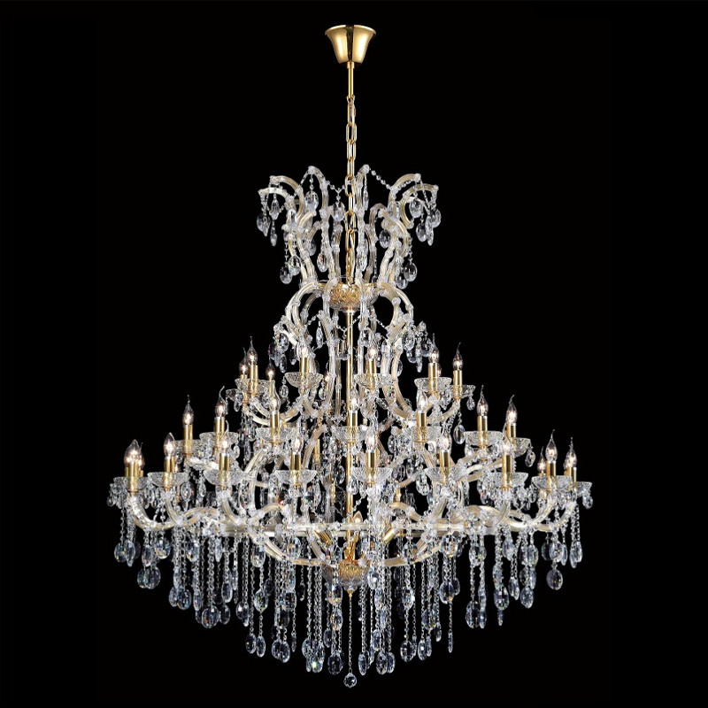 Люстра многоярусная с 53-мя лампочками и прозрачными хрустальными подвесками на основании золотого цвета Crystal lamps