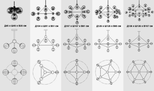 Золотистый каркас светильника сделан из металлических трубок и соединительных элементов. Наша компания Loft Concept предлагает два цветовых решения: черный и золотой цвета. Плафоны сферической формы сделаны из борсиликатного стекла и имеют три цветовых решения: прозрачный, затемненный и непрозрачный матовый белый цвета. Также эта люстра представлена на различное количество плафонов: 5, 10, 15, 18, 21.