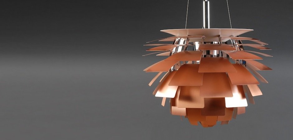Люстра PH Artichoke Pendant считается классическим шедевром более 40 лет. Структура состоит из двенадцати стальных арок. На них размещены 72 медных «листа» в шахматном порядке.