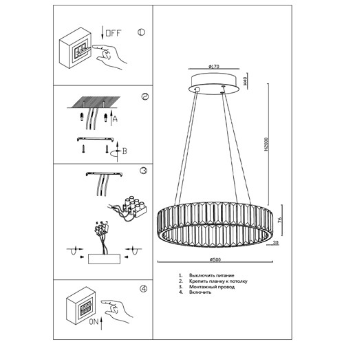 Высота цепи/троса, см — 204, Высота с цепью/тросом, см — 211.6, Хром - 4000К, Золото - 3000К
