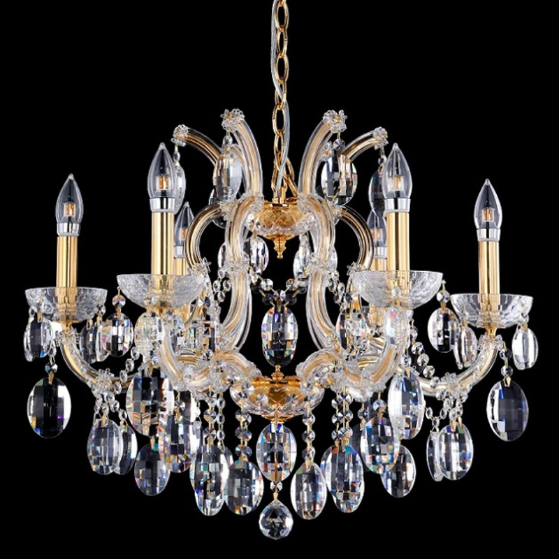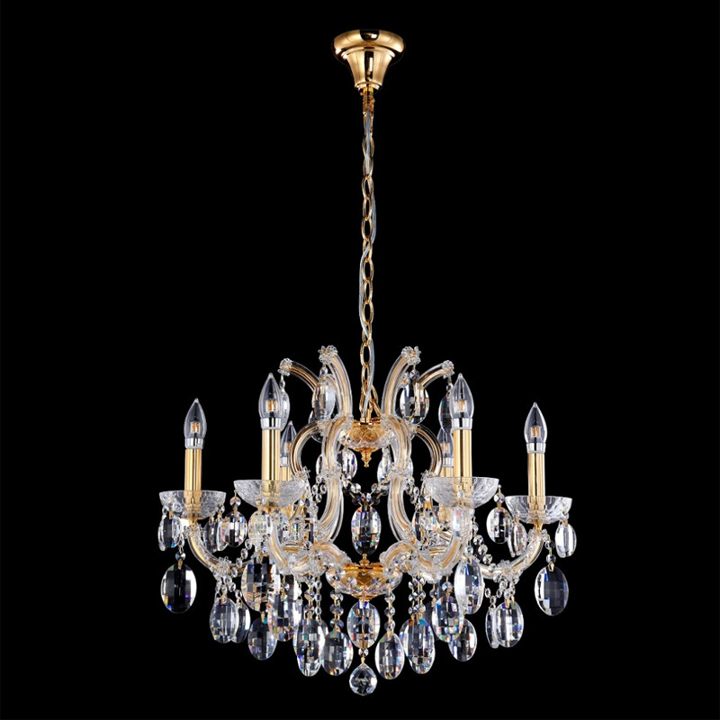 Люстра подвесная с 6-ю лампочками и прозрачными хрустальными подвесками на основании золотого цвета Crystal lamps